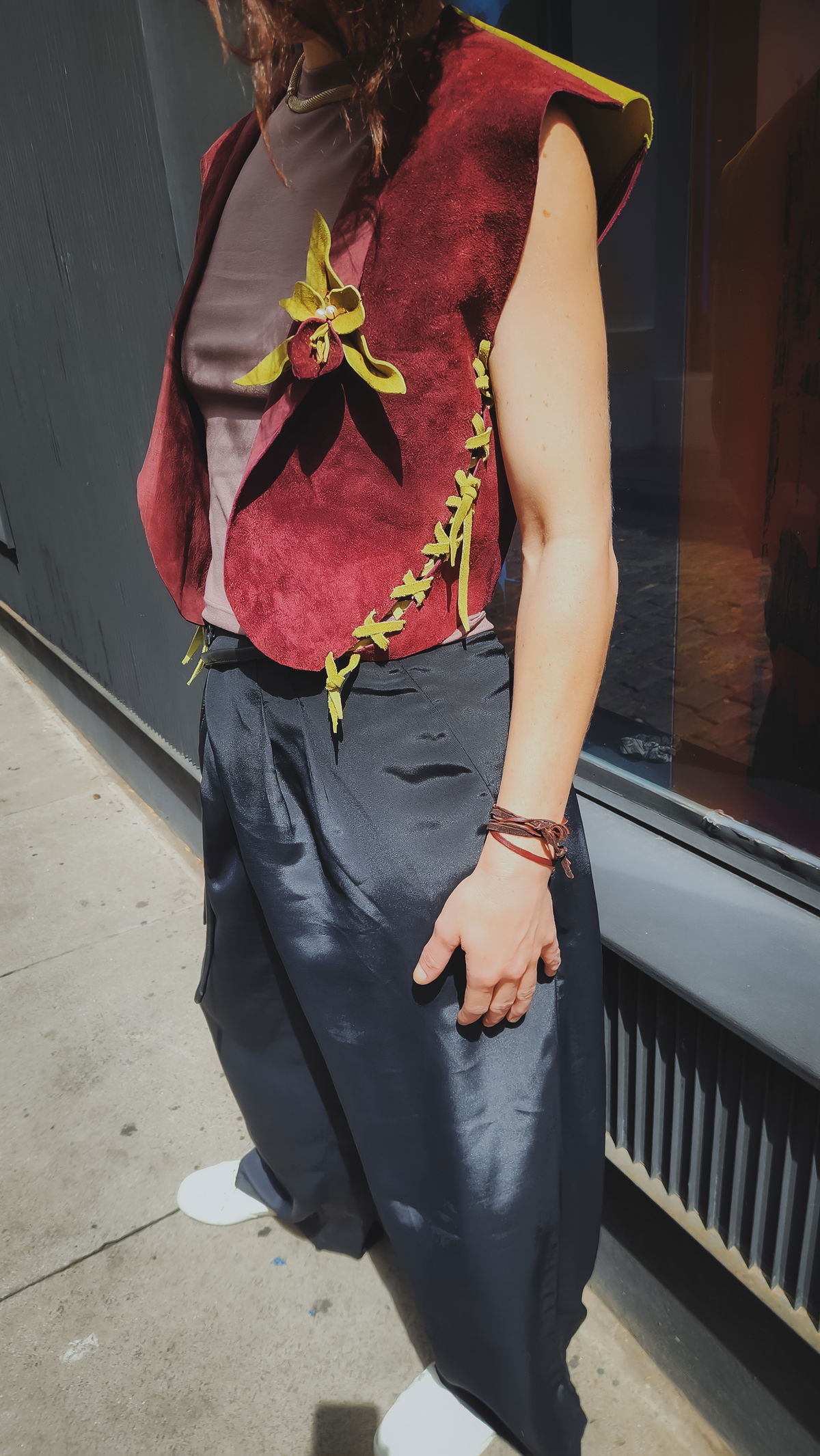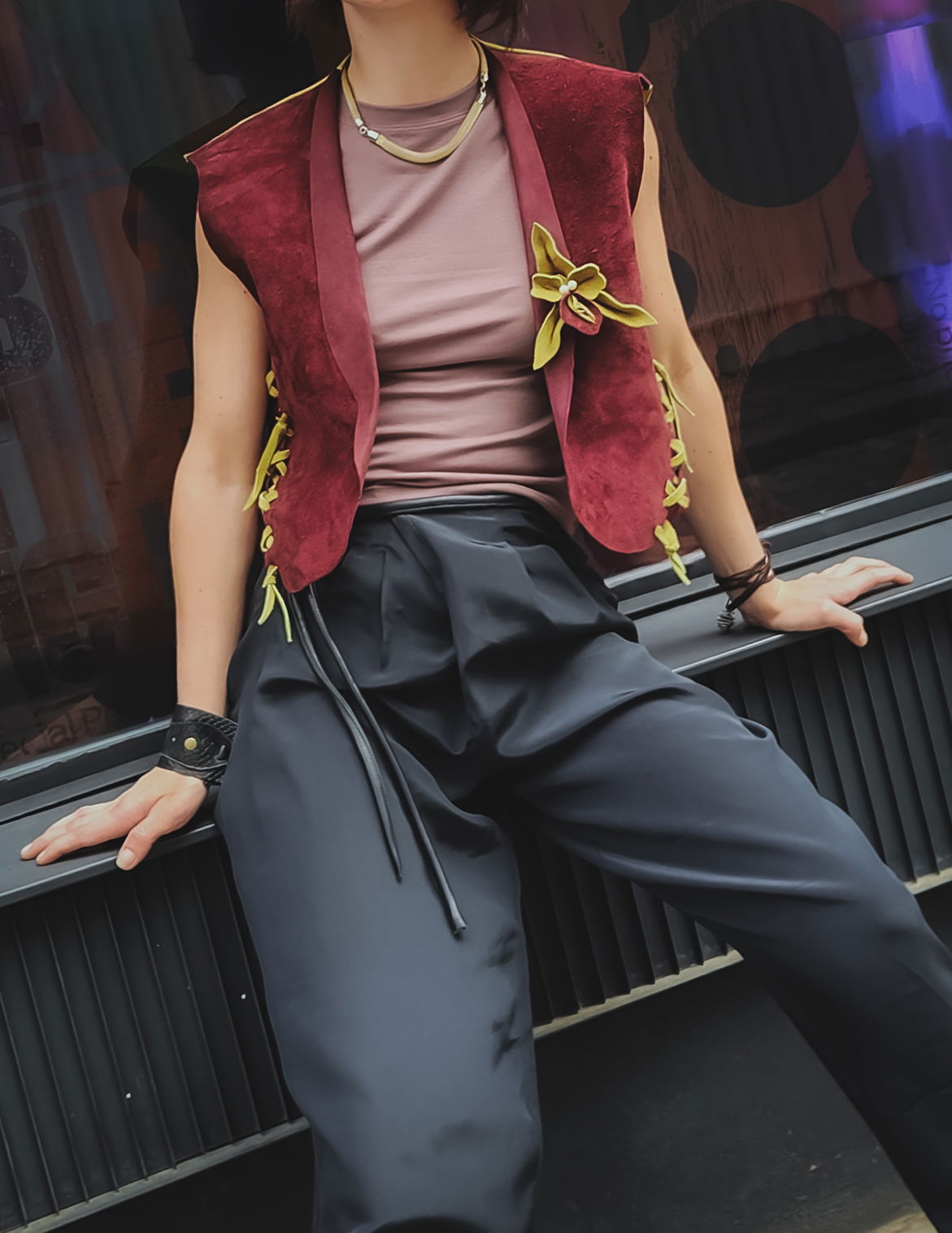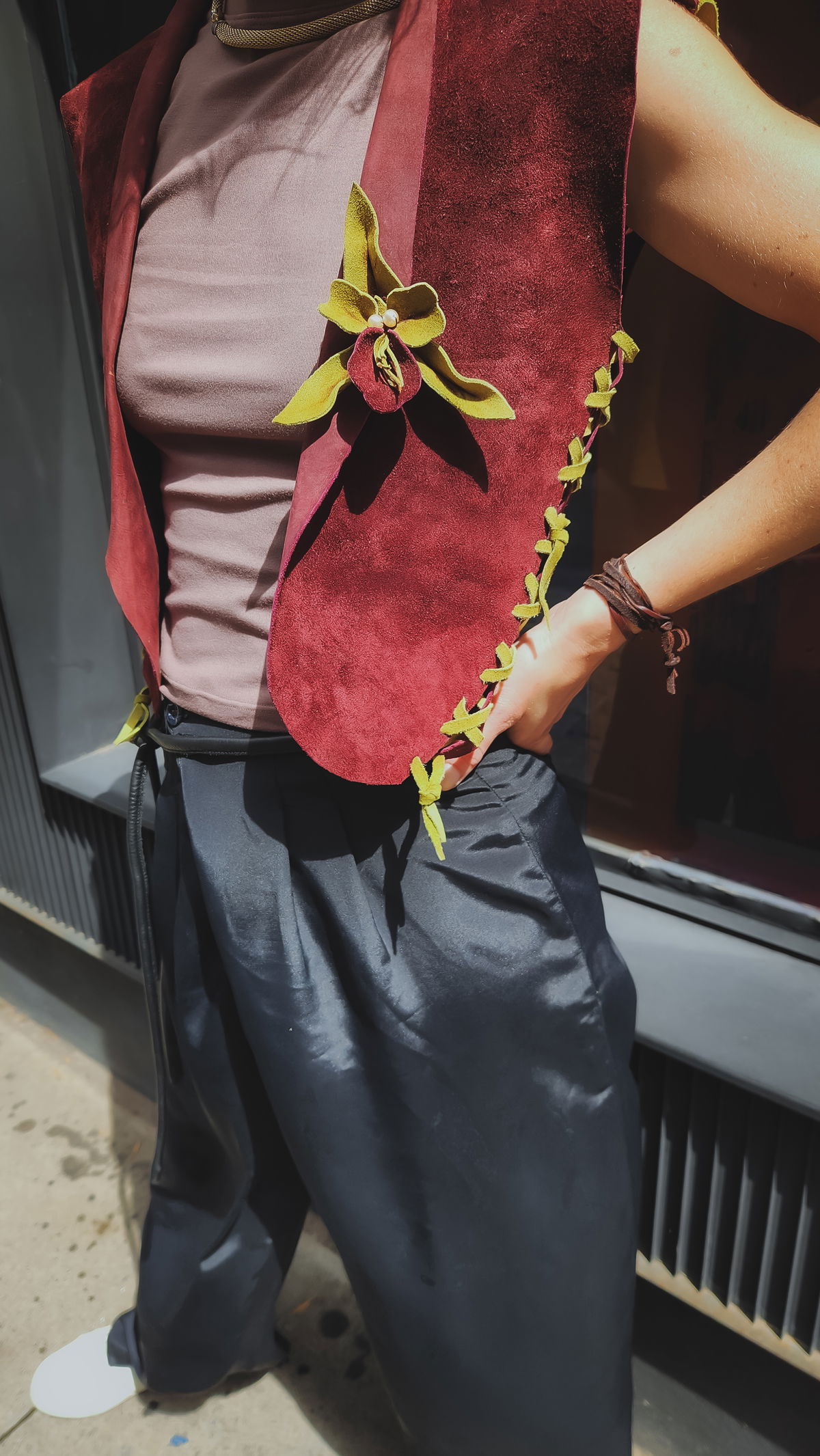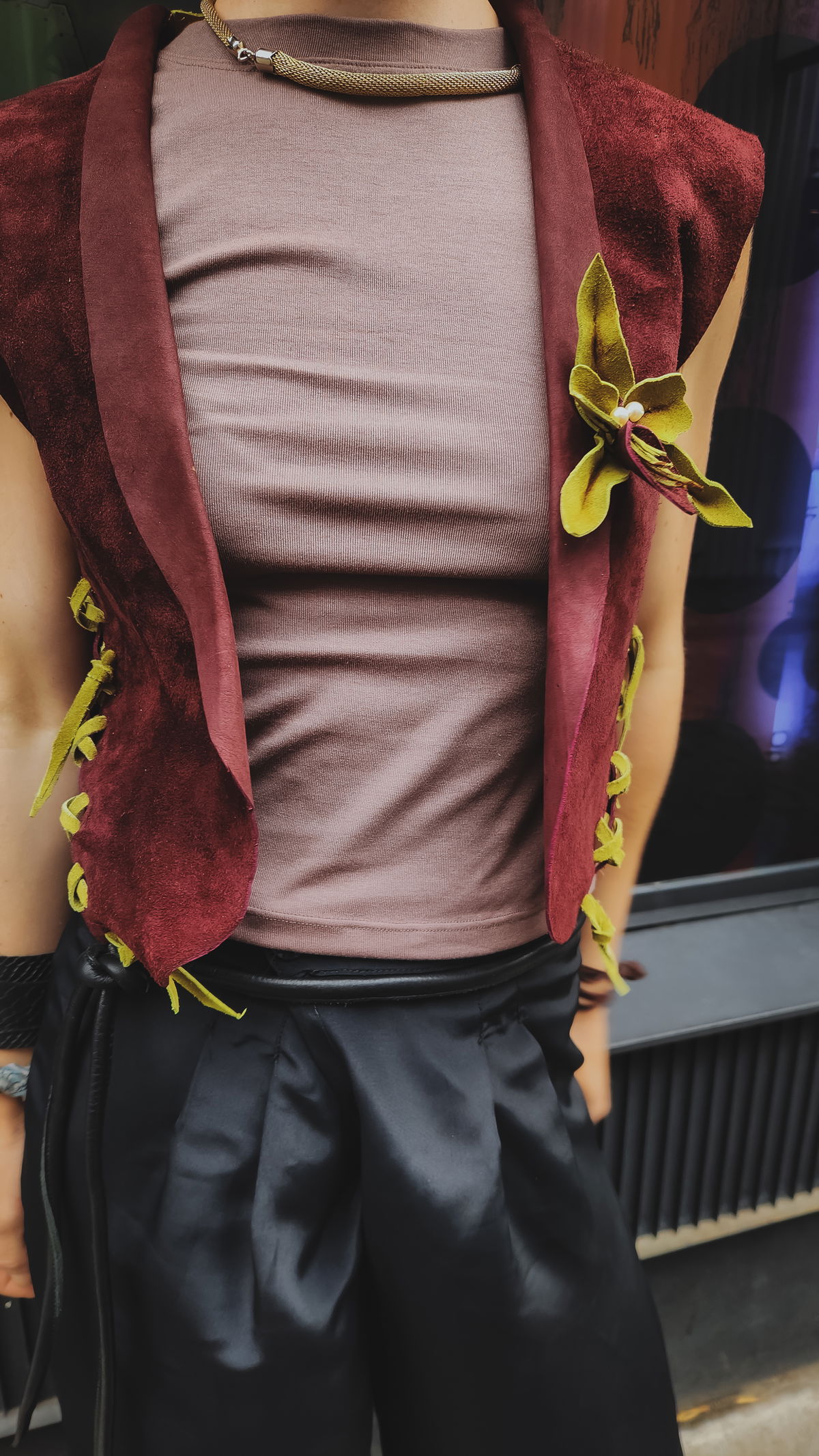 La gamuza aterciopelada en un tono borravino intenso evoca una elegancia poco convencional y profunda, que se rompe de forma inesperada con una espalda en color pistacho. Es un juego de opuestos: la sobriedad del frente frente a la vitalidad botánica de la espalda. Al usarlo, el roce suave del material se encuentra con el detalle de la flor de cuero, una mezcla moderna que transmite magnetismo apenas salís a la calle. Es una pieza diseñada para adaptarse no solo a tu estilo, sino a tu cuerpo, con un sistema de ajuste en axilas y cintura que permite que la prenda respire con vos.