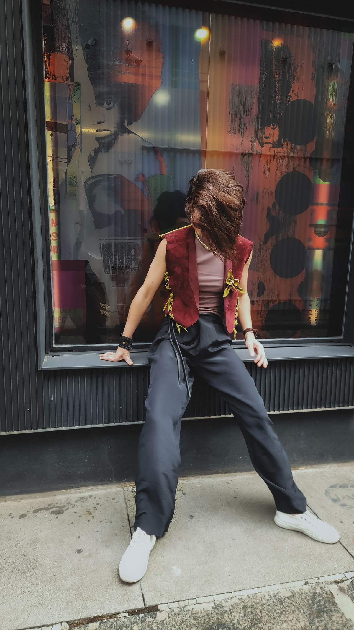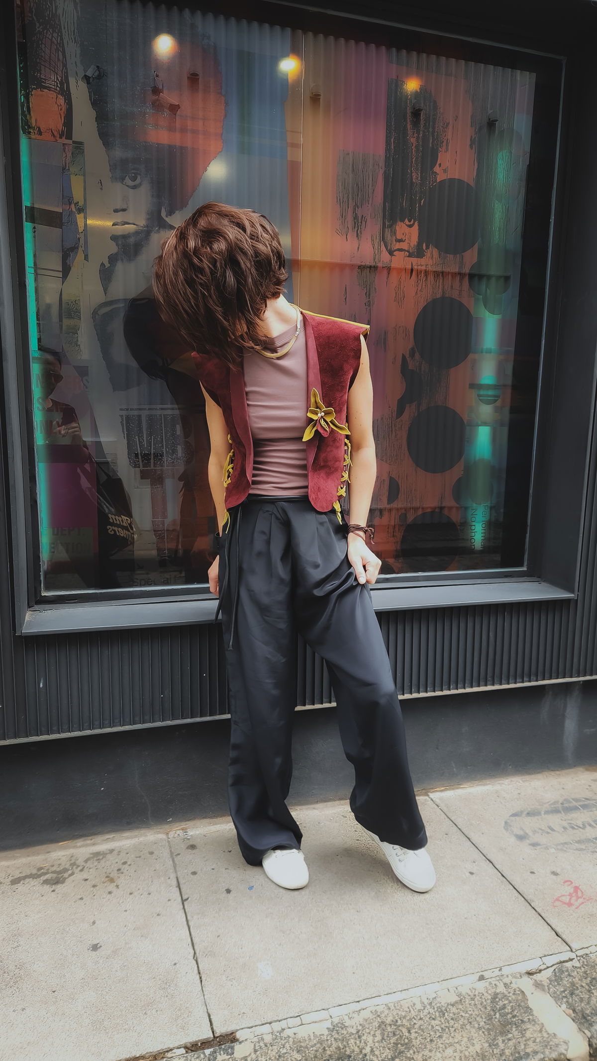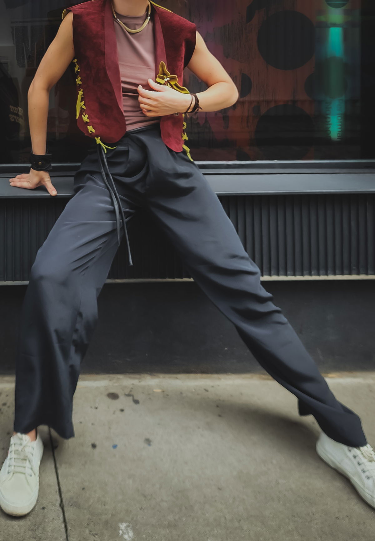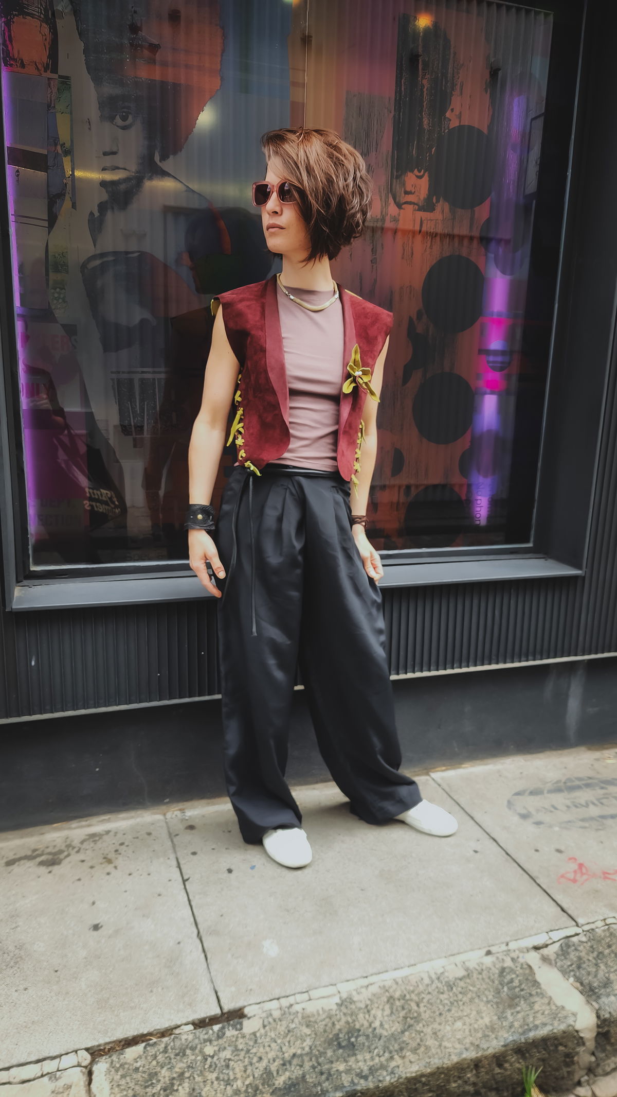 La gamuza aterciopelada en un tono borravino intenso evoca una elegancia poco convencional y profunda, que se rompe de forma inesperada con una espalda en color pistacho. Es un juego de opuestos: la sobriedad del frente frente a la vitalidad botánica de la espalda. Al usarlo, el roce suave del material se encuentra con el detalle de la flor de cuero, una mezcla moderna que transmite magnetismo apenas salís a la calle. Es una pieza diseñada para adaptarse no solo a tu estilo, sino a tu cuerpo, con un sistema de ajuste en axilas y cintura que permite que la prenda respire con vos.