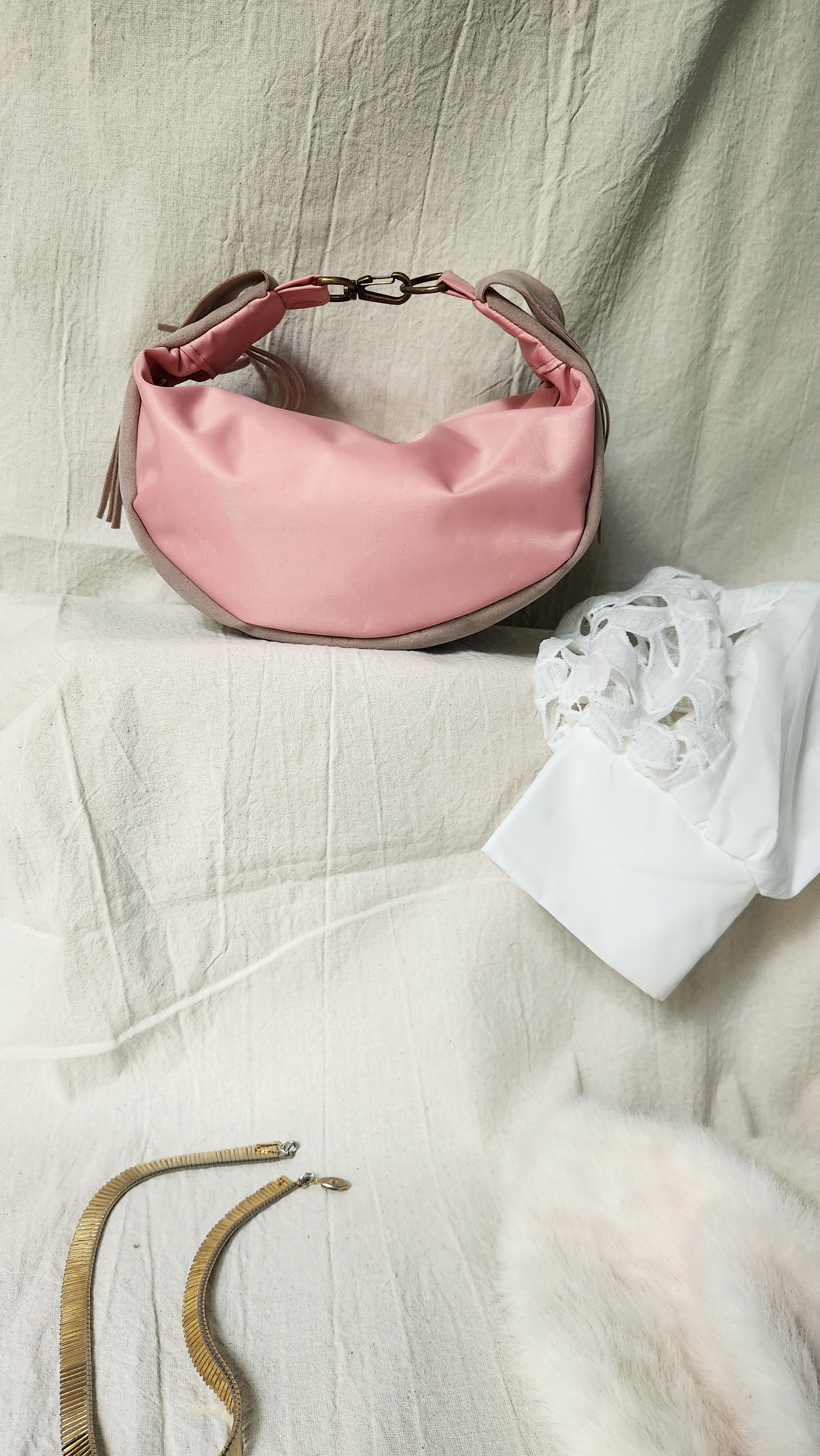 Este bolso de mano es delicado, elegante y versátil. Su diseño de media luna y la combinación de materiales le dan un aire contemporáneo y muy chic.