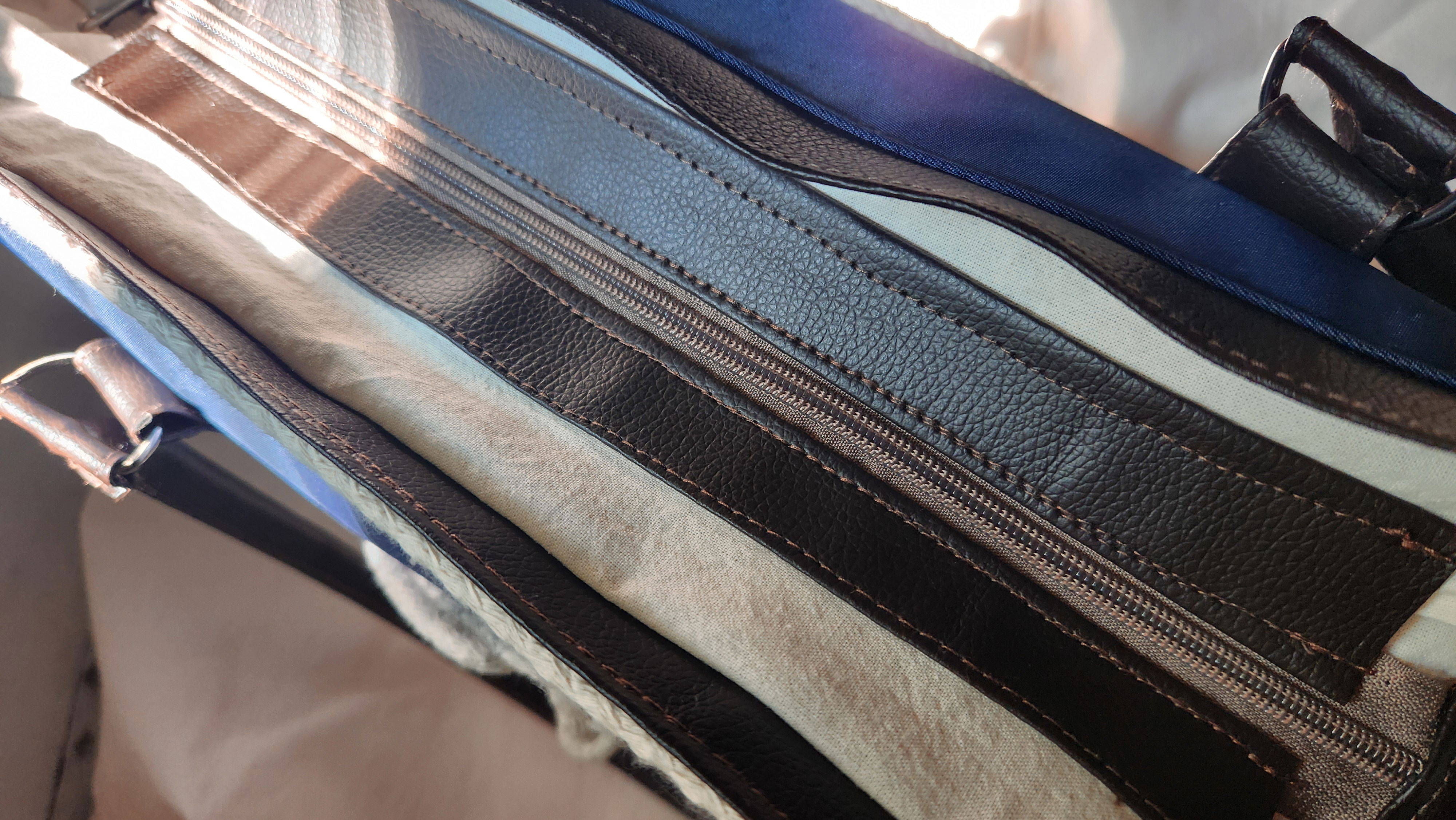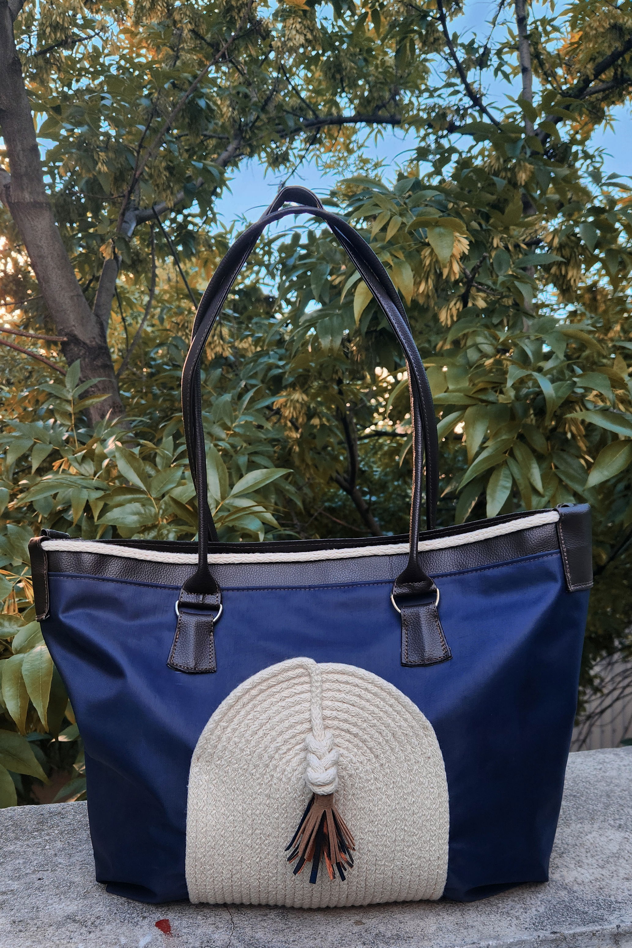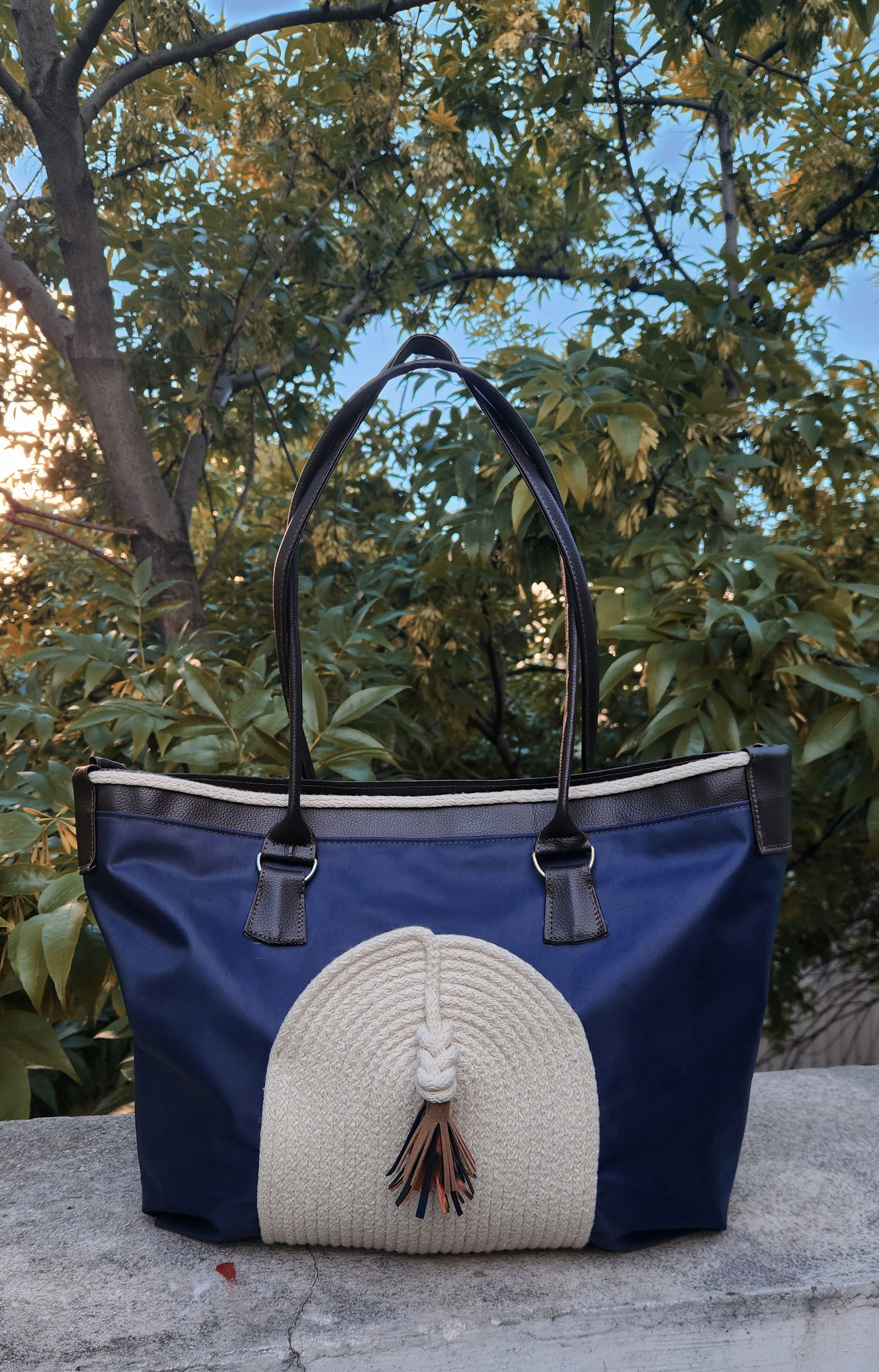 En un sofisticado Azul Marino, esta pieza combina la resistencia de la tela andorra con la calidez del simil cuero marrón oscuro en sus asas y detalles, además del toque artesanal del tejido natural crudo.