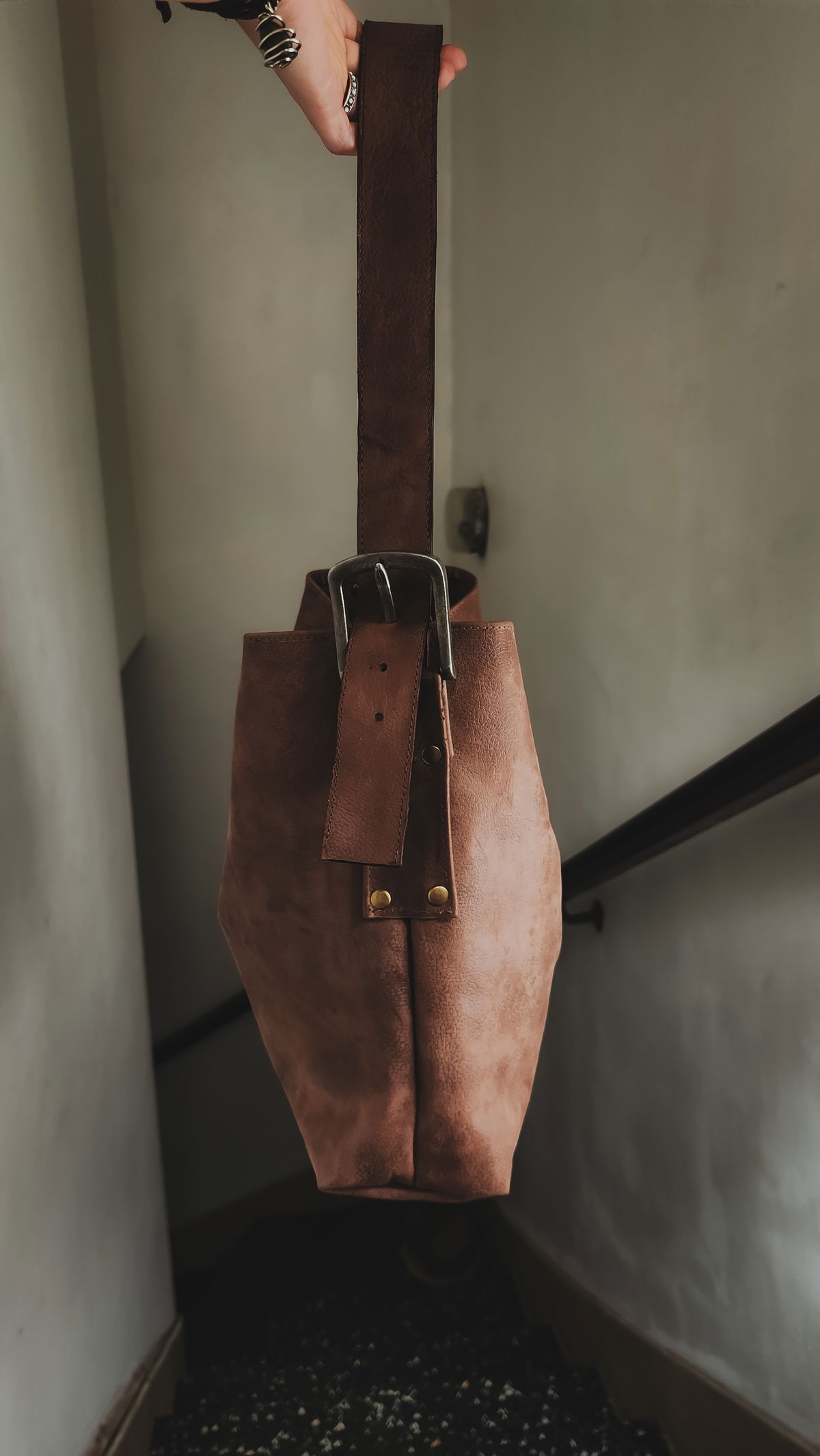 • Detalles artesanales: remaches de bronce, hebilla metálica, correa regulable