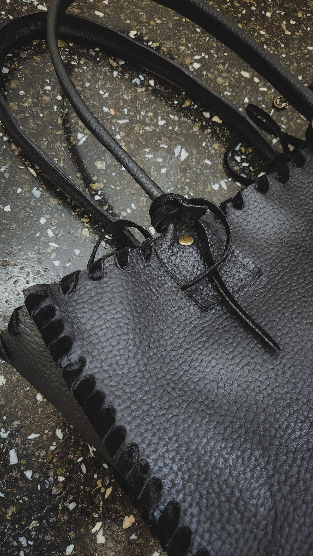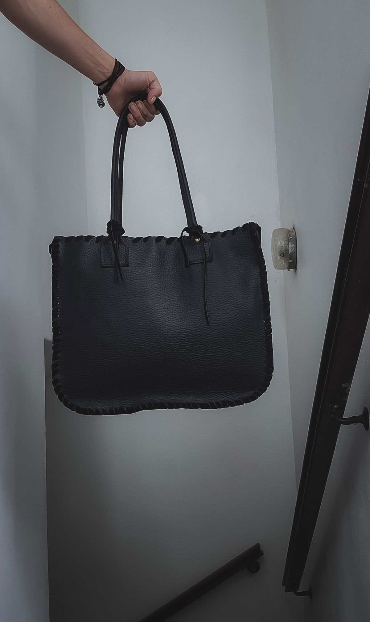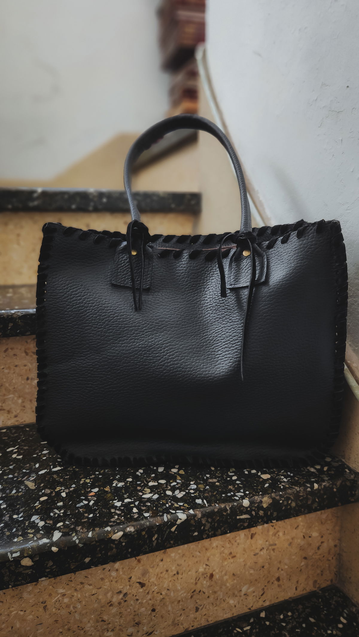 El negro total en formato tote estándar transmite poder y amplitud, ofreciendo espacio y seguridad en cualquier lugar. La superficie de cuero vacuno graneado se distingue por el trenzado artesanal en los bordes, una repetición que sentís en las manos cada vez que buscás las llaves o el teléfono en su interior.