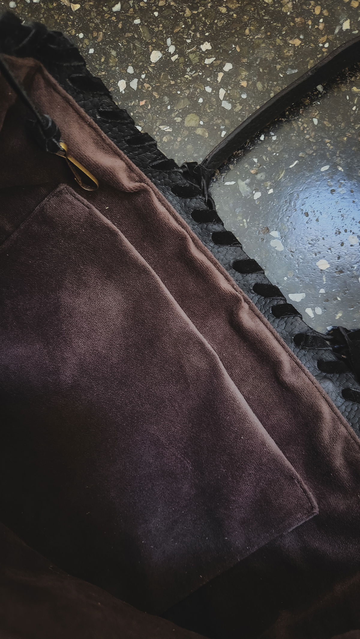 • Interior: forrado en pana marrón profundo con bolsillo