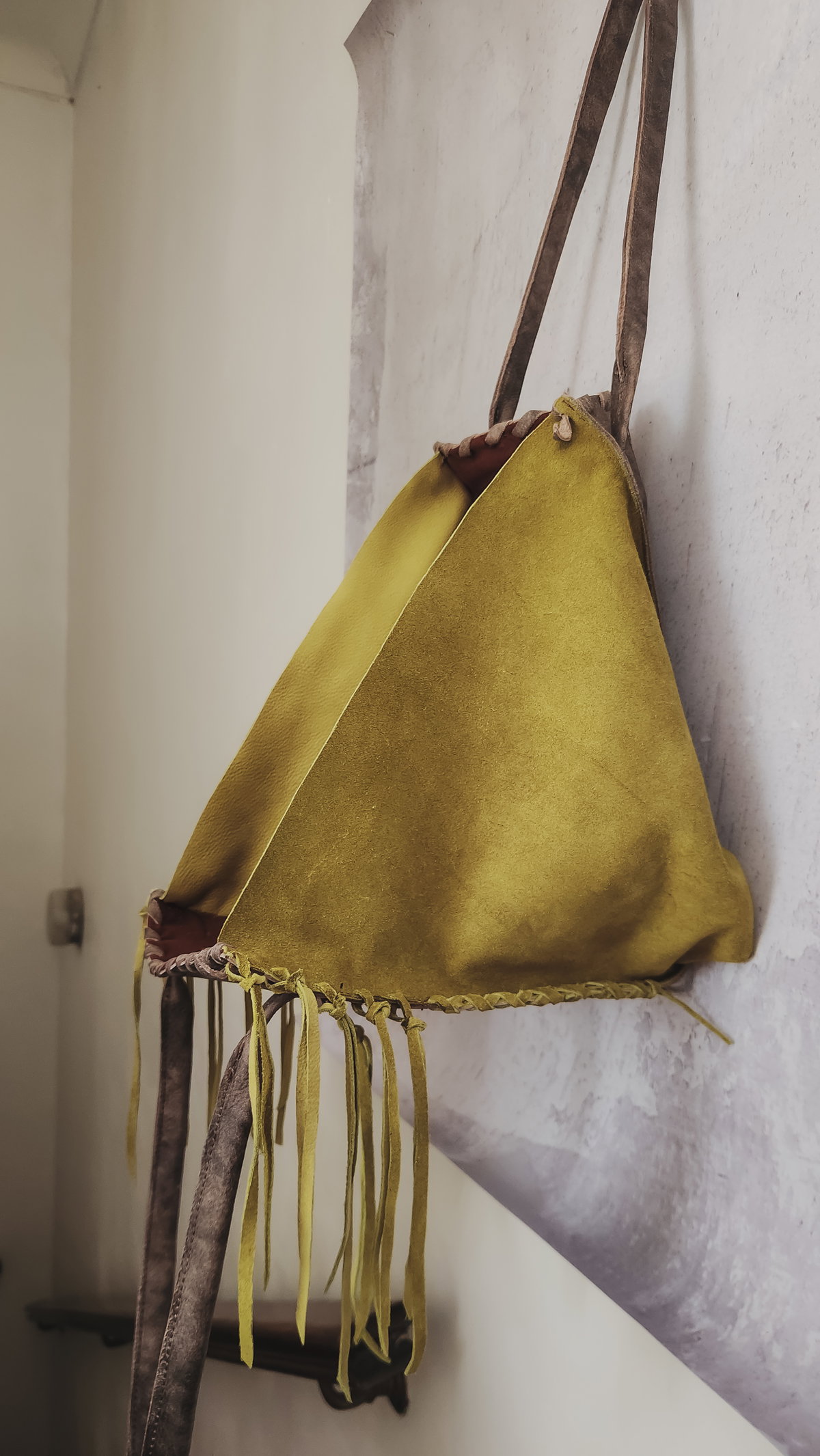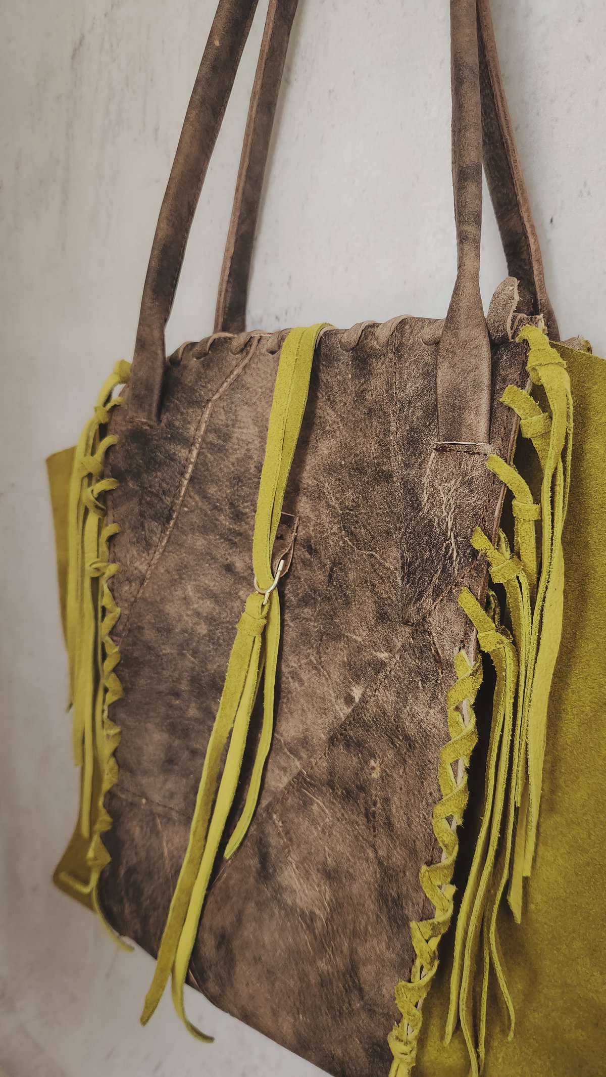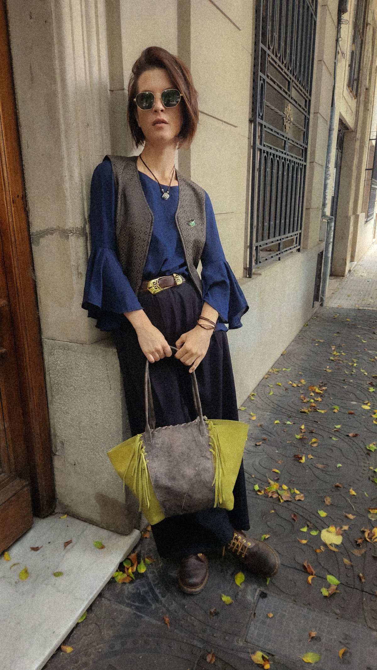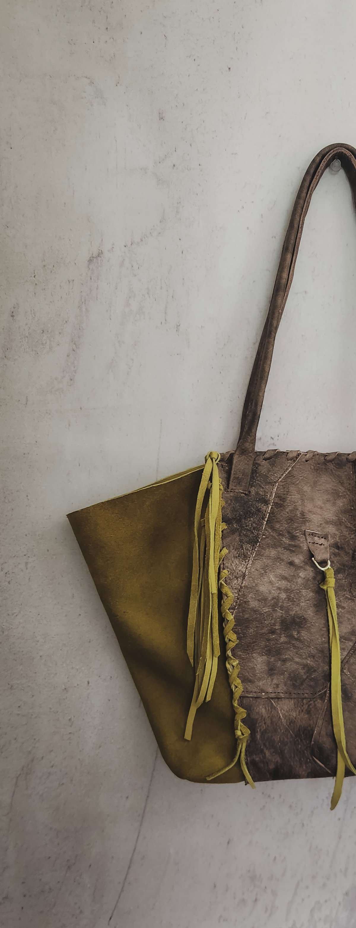 Bautizada como San Patricio, esta cartera destaca por su juego creativo de texturas y tonos. El frente y las asas están creados a partir de pequeños trozos de cuero unidos uno por uno, logrando un trabajo de ensamble único. Sus laterales en cuero de descarne verde aportan ese toque distintivo y fresco. Es una pieza canchera y funcional, con el tamaño ideal para acompañar tu ritmo diario, desde la facultad hasta una tarde de paseo.