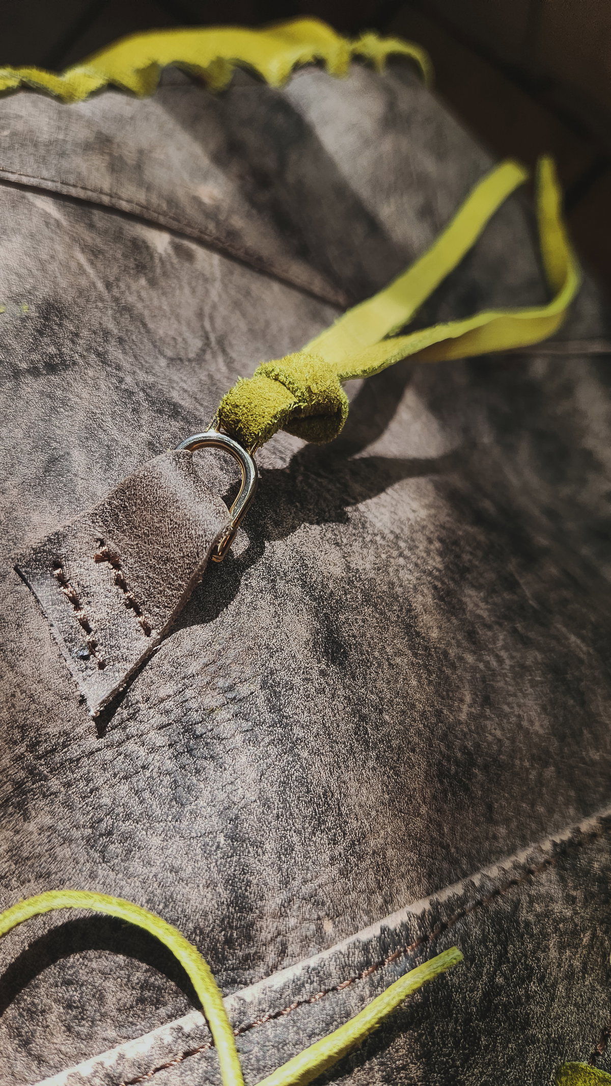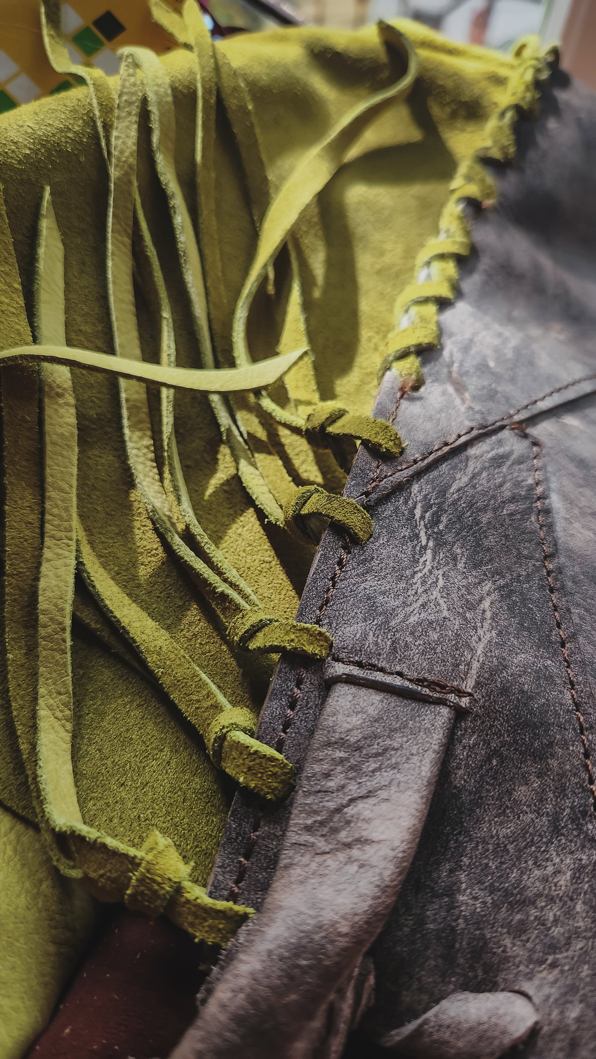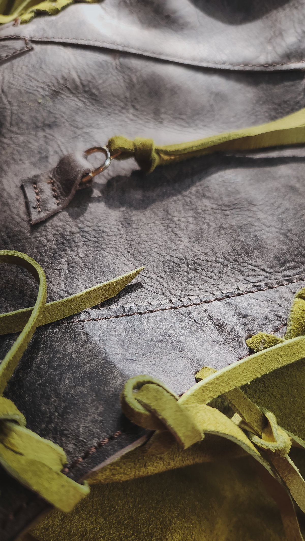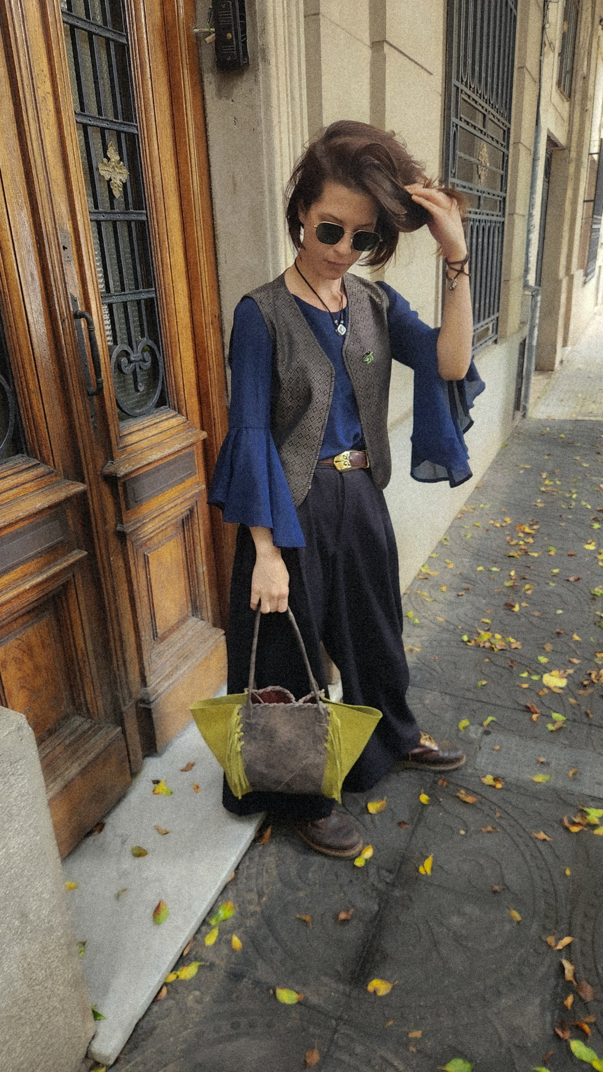 Bautizada como San Patricio, esta cartera destaca por su juego creativo de texturas y tonos. El frente y las asas están creados a partir de pequeños trozos de cuero unidos uno por uno, logrando un trabajo de ensamble único. Sus laterales en cuero de descarne verde aportan ese toque distintivo y fresco. Es una pieza canchera y funcional, con el tamaño ideal para acompañar tu ritmo diario, desde la facultad hasta una tarde de paseo.
