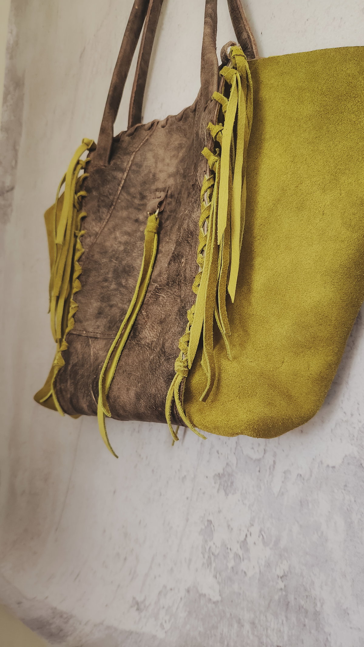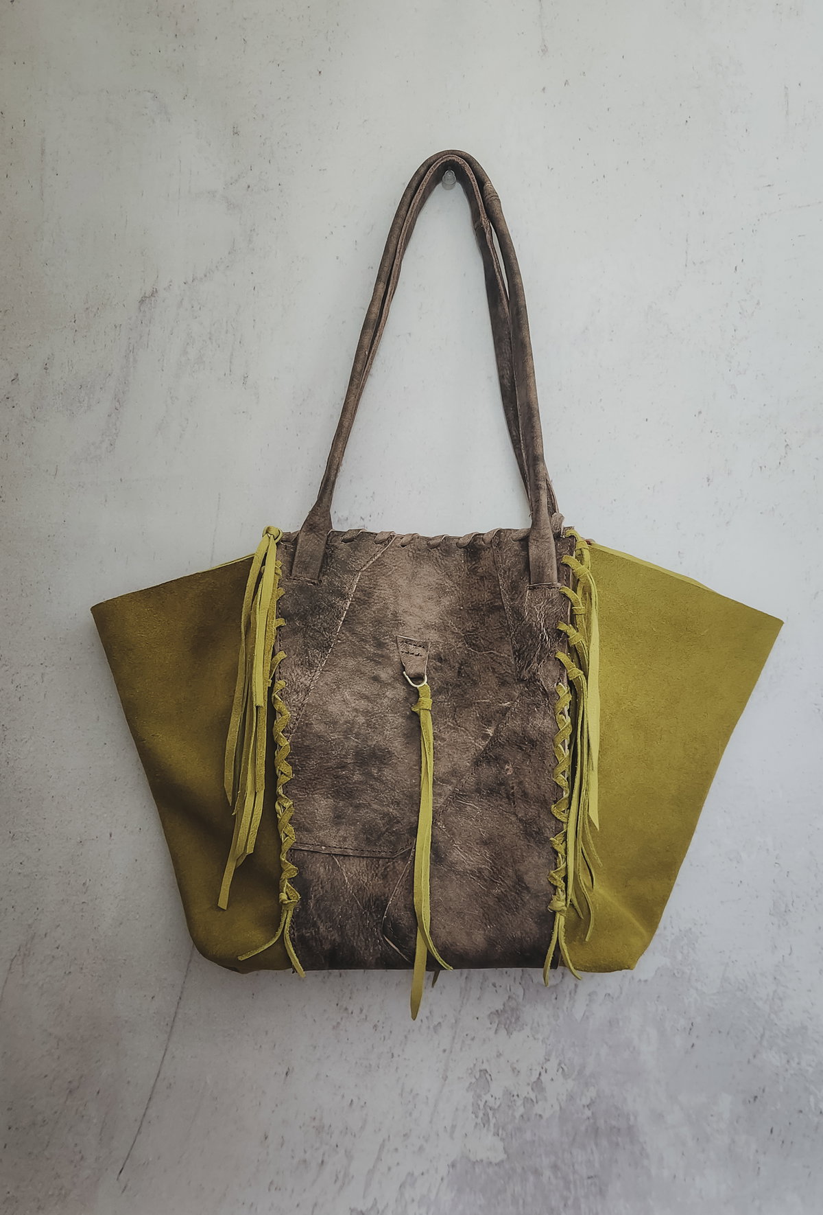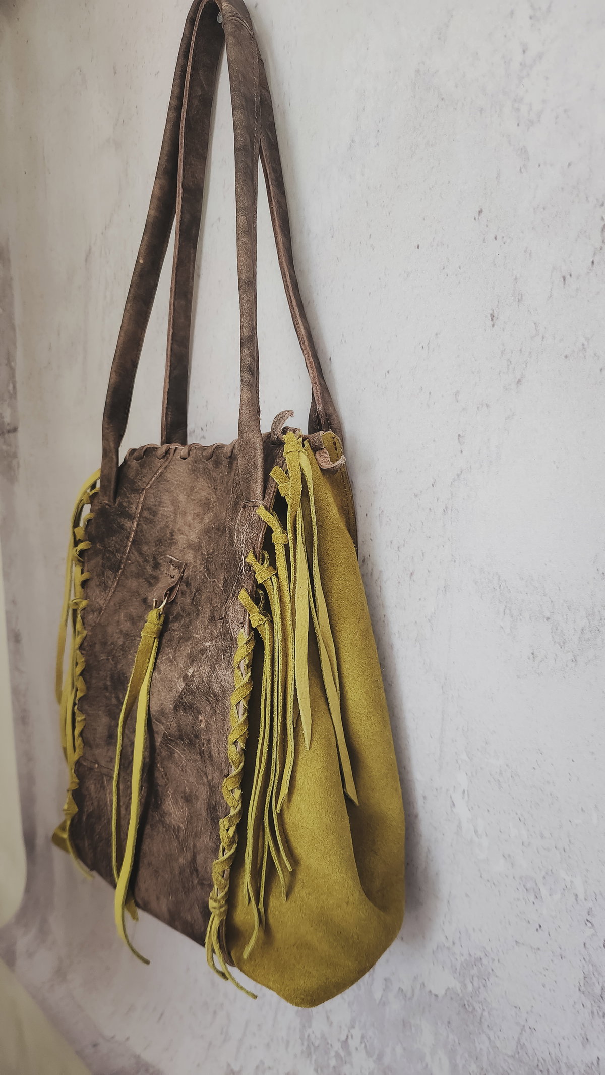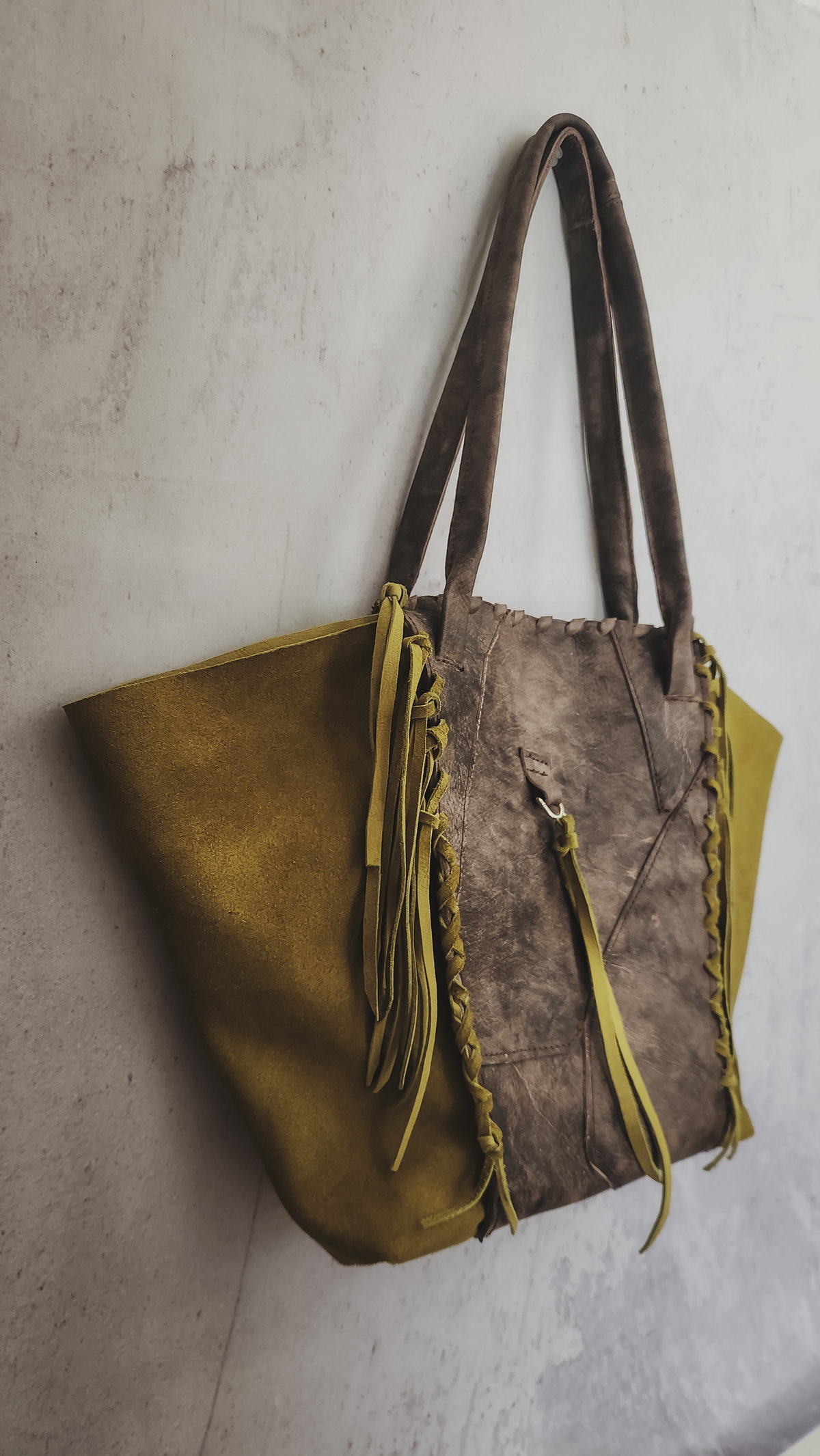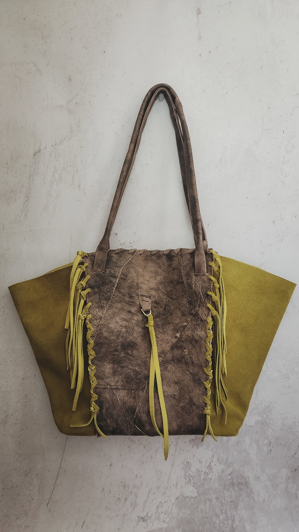 Bautizada como San Patricio, esta cartera destaca por su juego creativo de texturas y tonos. El frente y las asas están creados a partir de pequeños trozos de cuero unidos uno por uno, logrando un trabajo de ensamble único. Sus laterales en cuero de descarne verde aportan ese toque distintivo y fresco. Es una pieza canchera y funcional, con el tamaño ideal para acompañar tu ritmo diario, desde la facultad hasta una tarde de paseo.