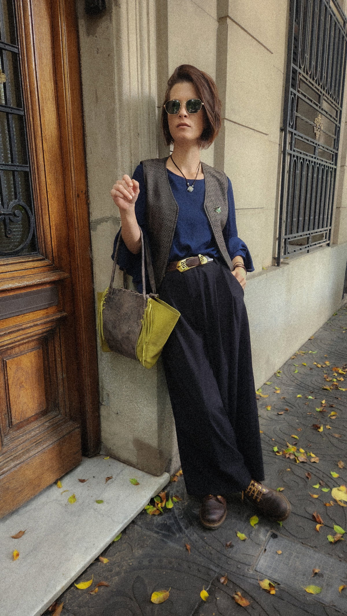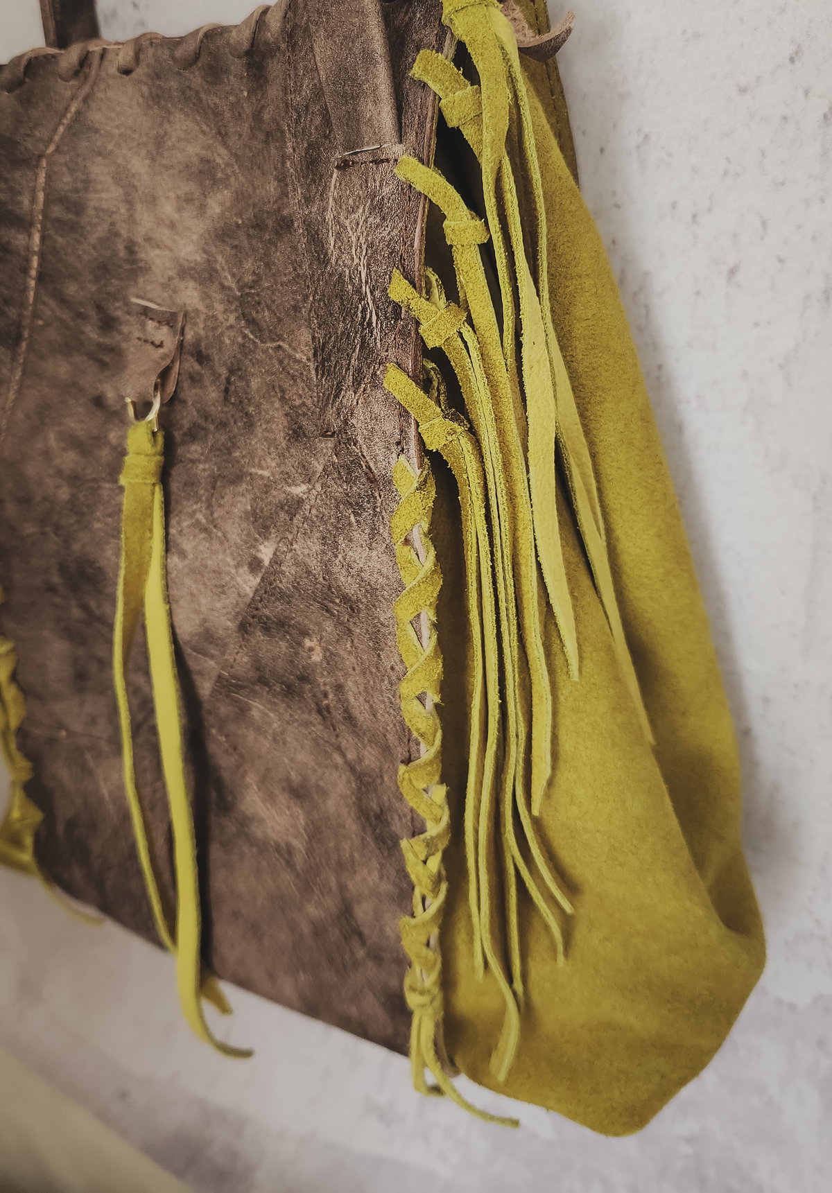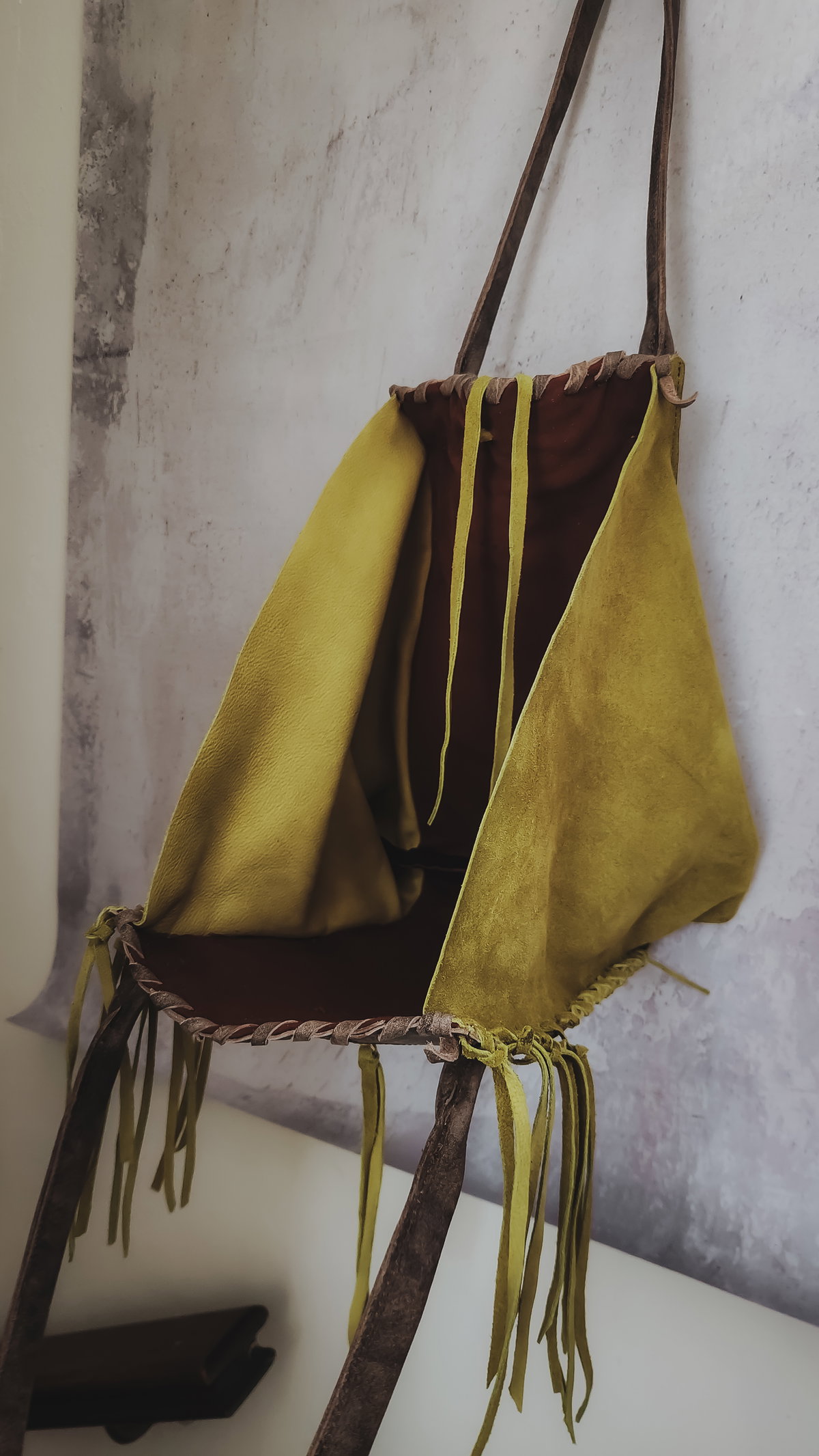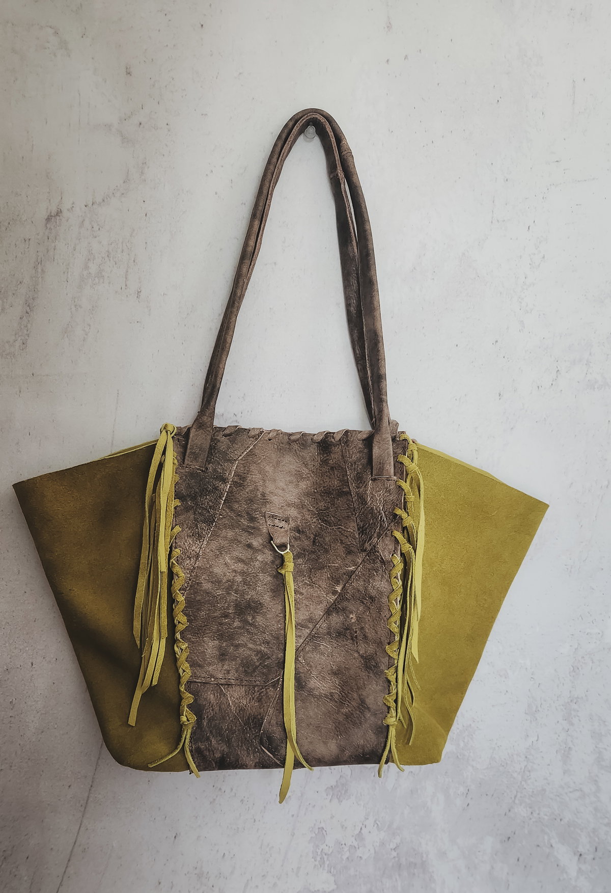 Bautizada como San Patricio, esta cartera destaca por su juego creativo de texturas y tonos. El frente y las asas están creados a partir de pequeños trozos de cuero unidos uno por uno, logrando un trabajo de ensamble único. Sus laterales en cuero de descarne verde aportan ese toque distintivo y fresco. Es una pieza canchera y funcional, con el tamaño ideal para acompañar tu ritmo diario, desde la facultad hasta una tarde de paseo.