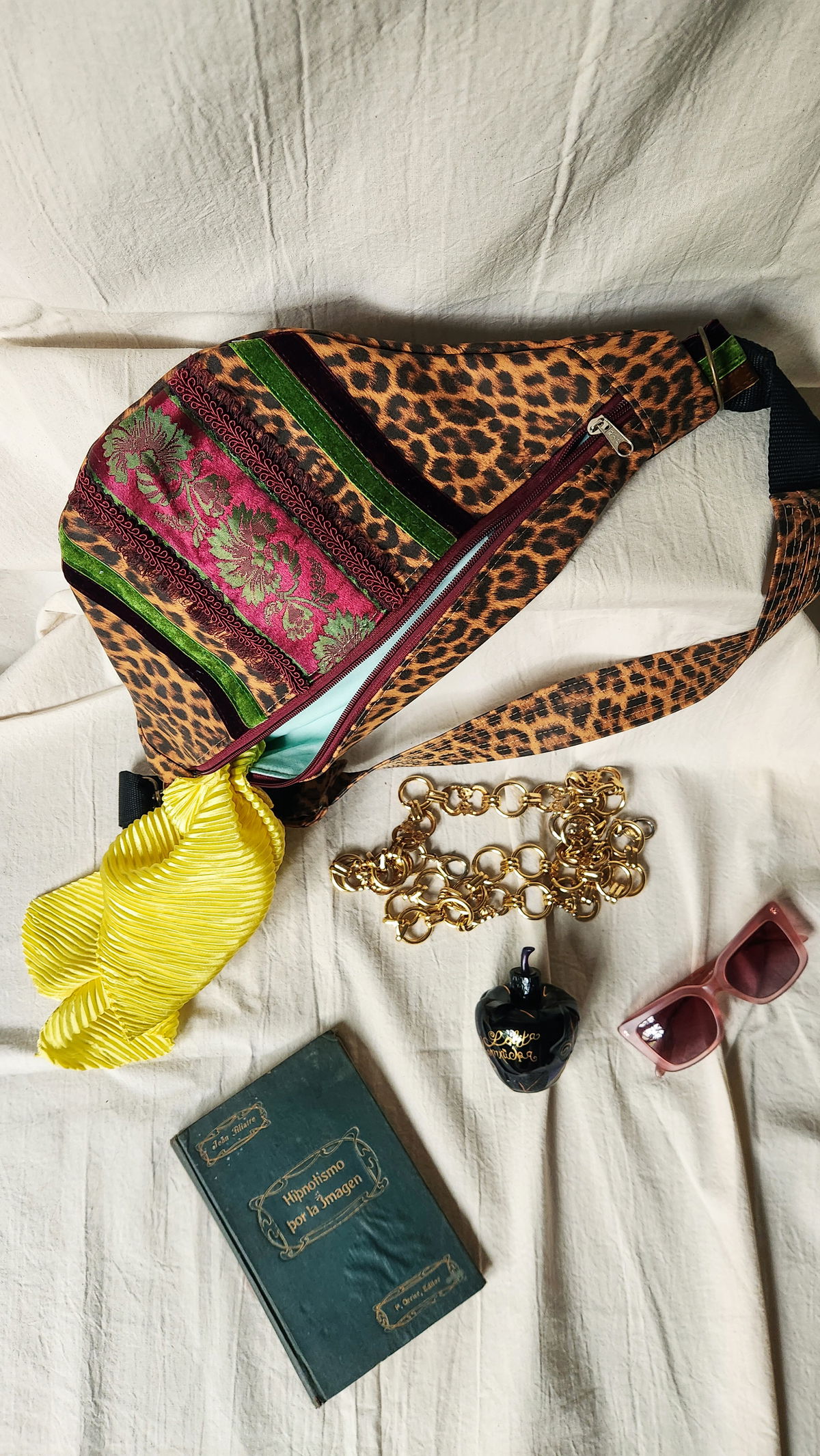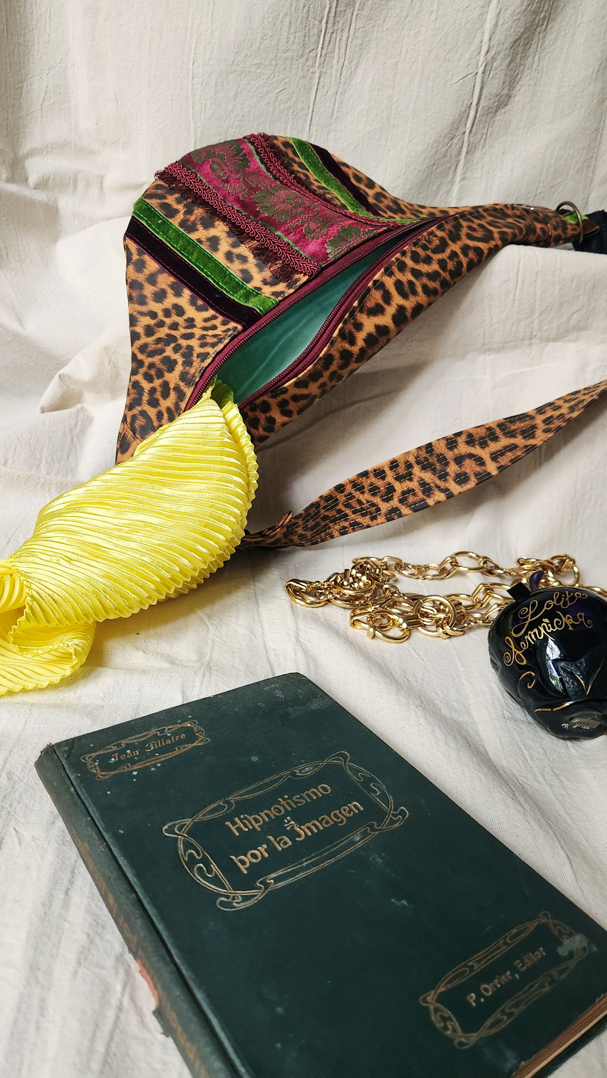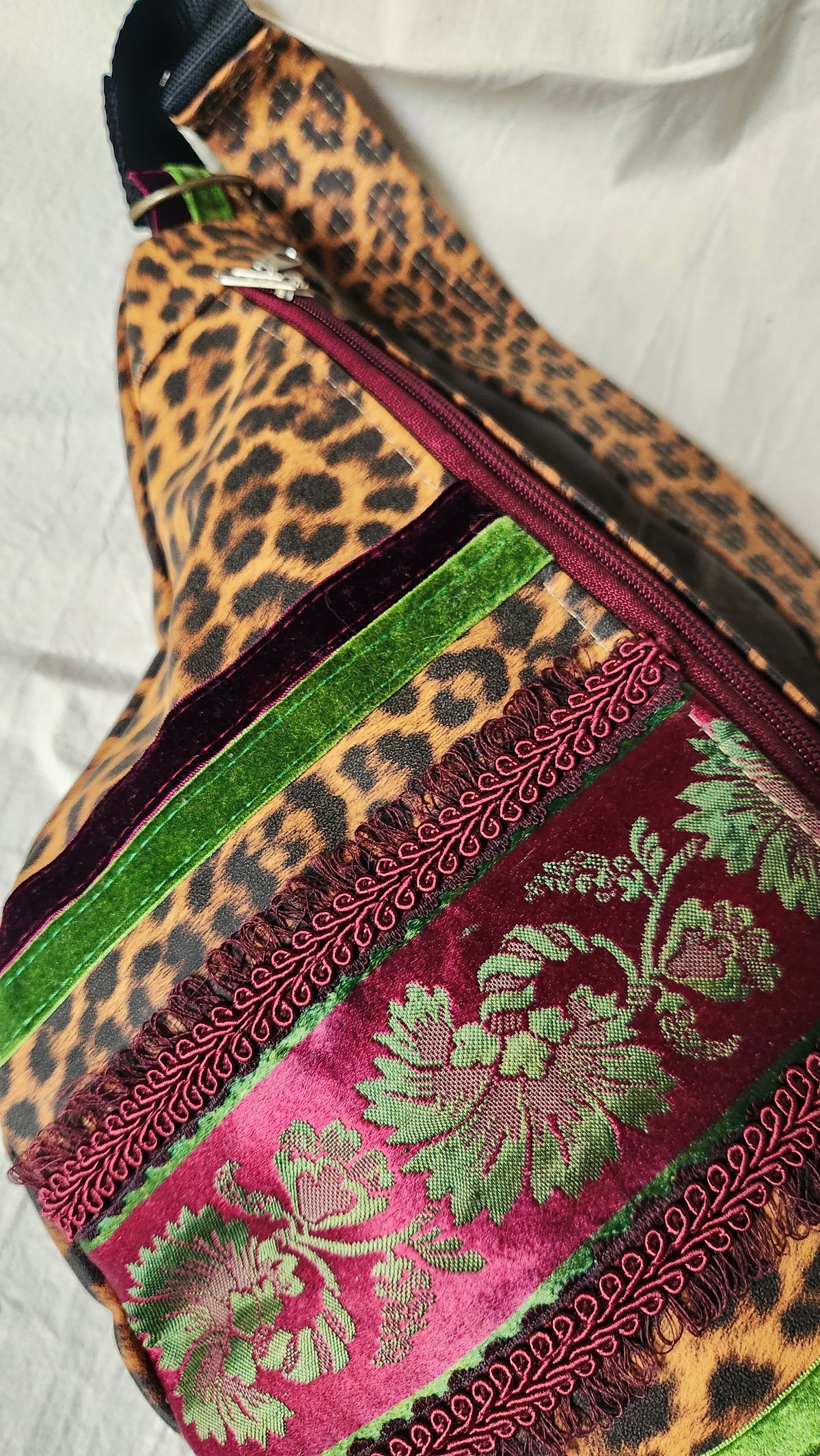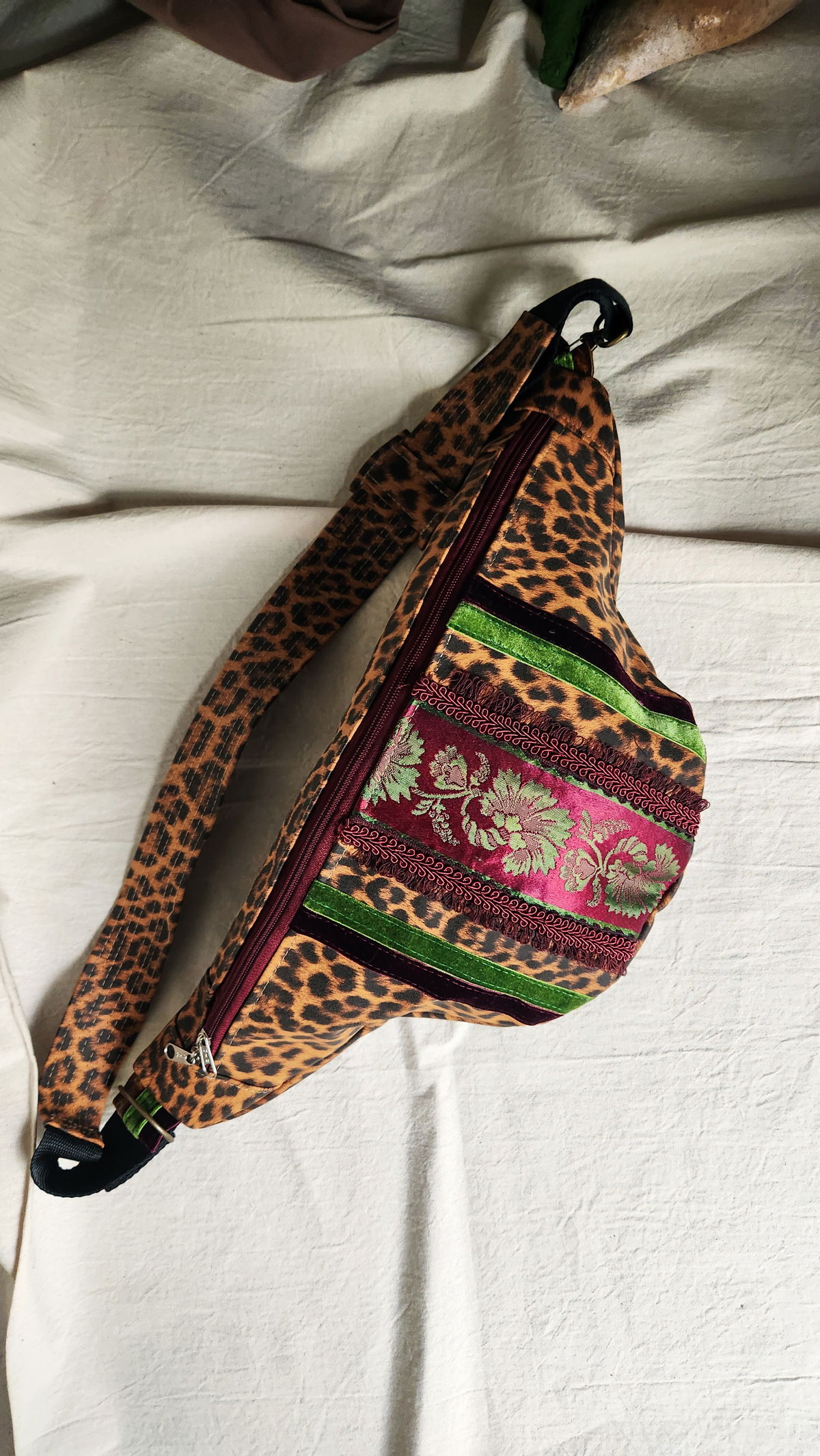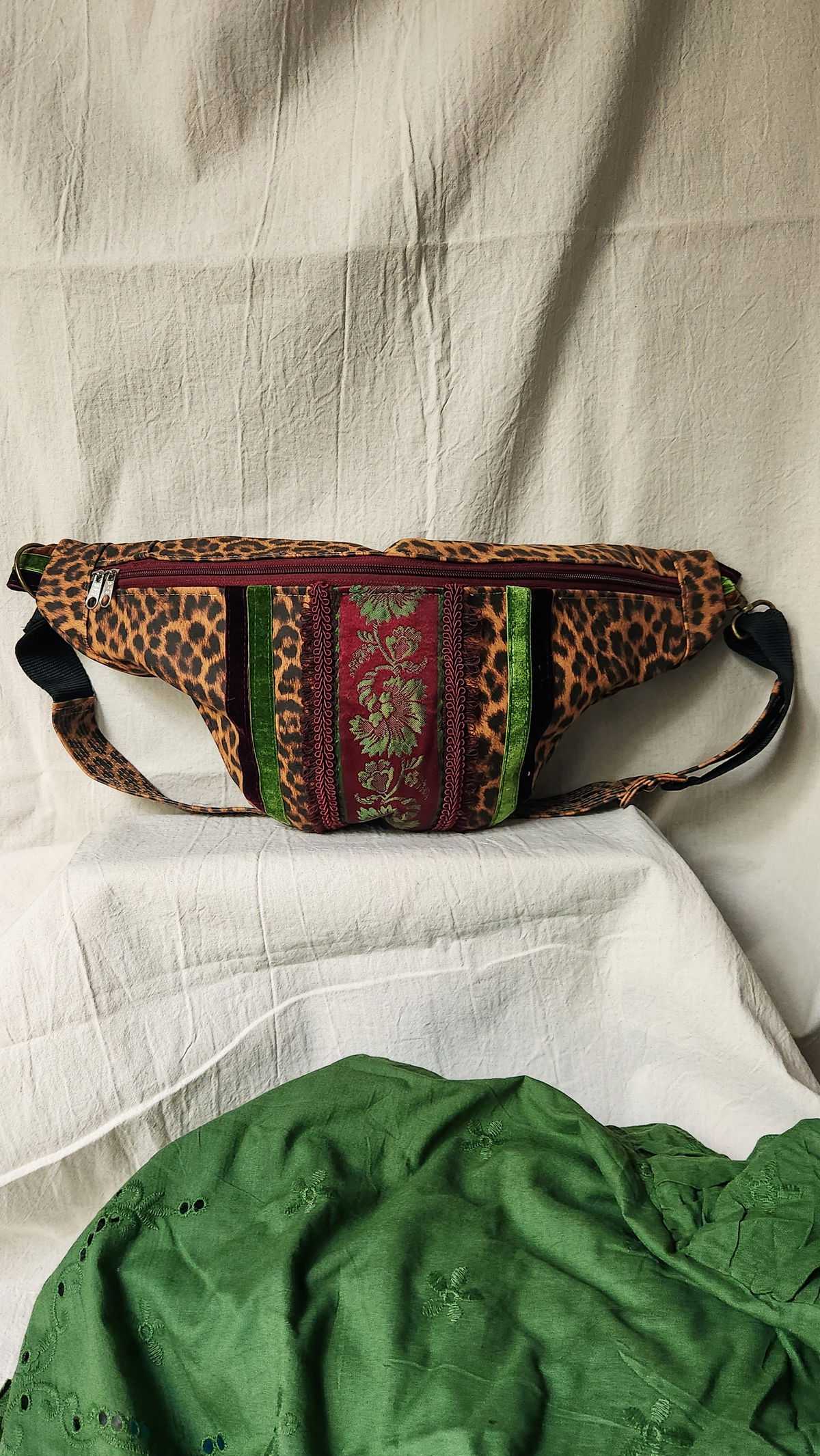Los galones que adornan el frente provienen de textiles vintage recuperados, incluyendo terciopelo verde esmeralda y un galón burdeos bordado. Vas a tener una pieza única que muy difícilmente se repita.