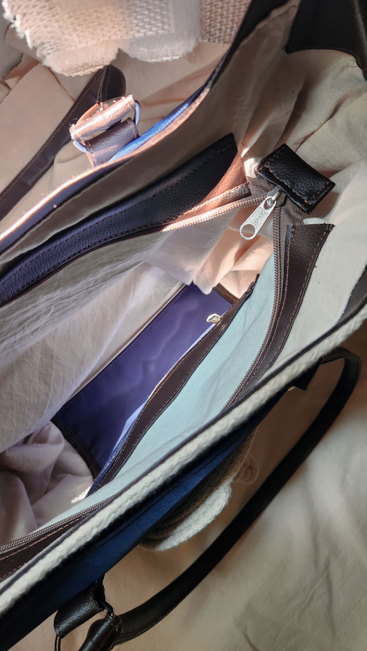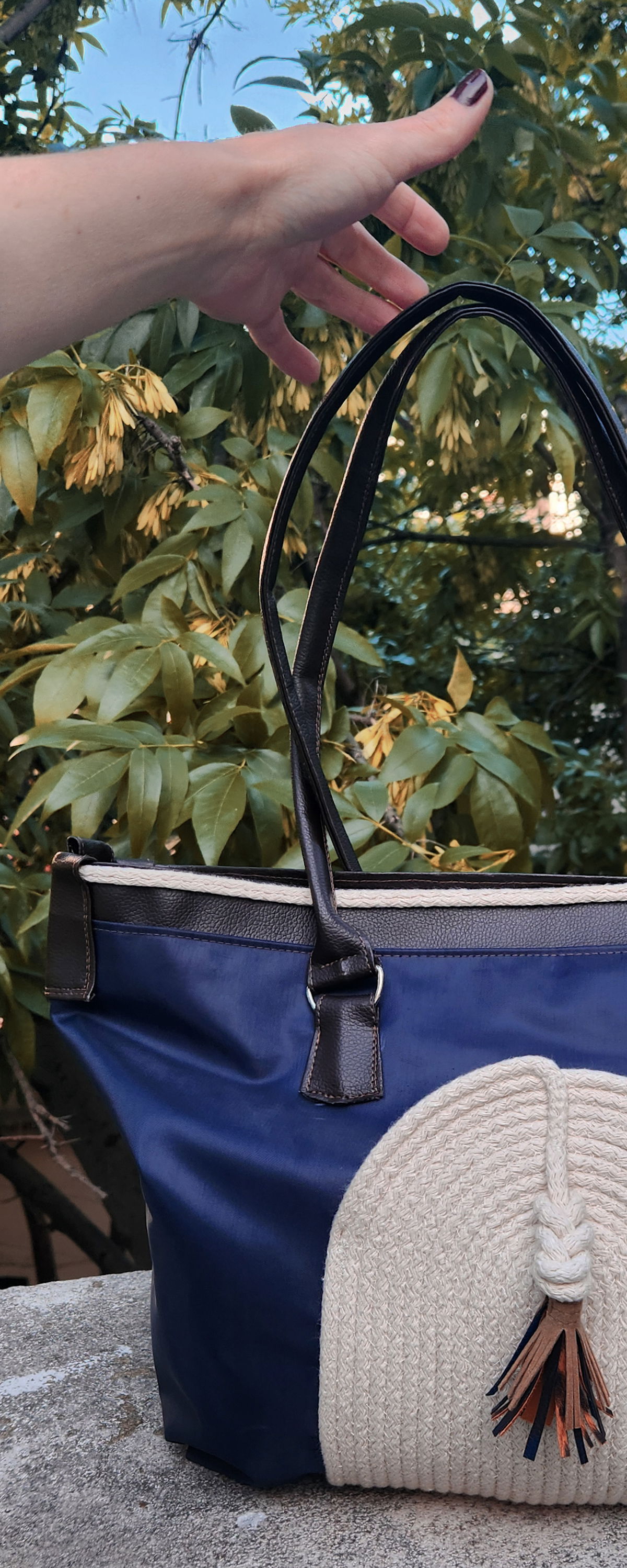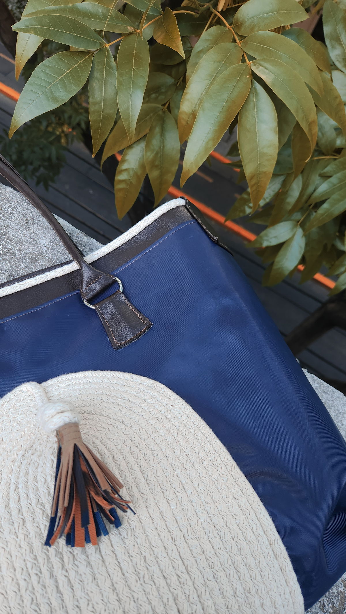 En un sofisticado Azul Marino, esta pieza combina la resistencia de la tela andorra con la calidez del simil cuero marrón oscuro en sus asas y detalles, además del toque artesanal del tejido natural crudo.