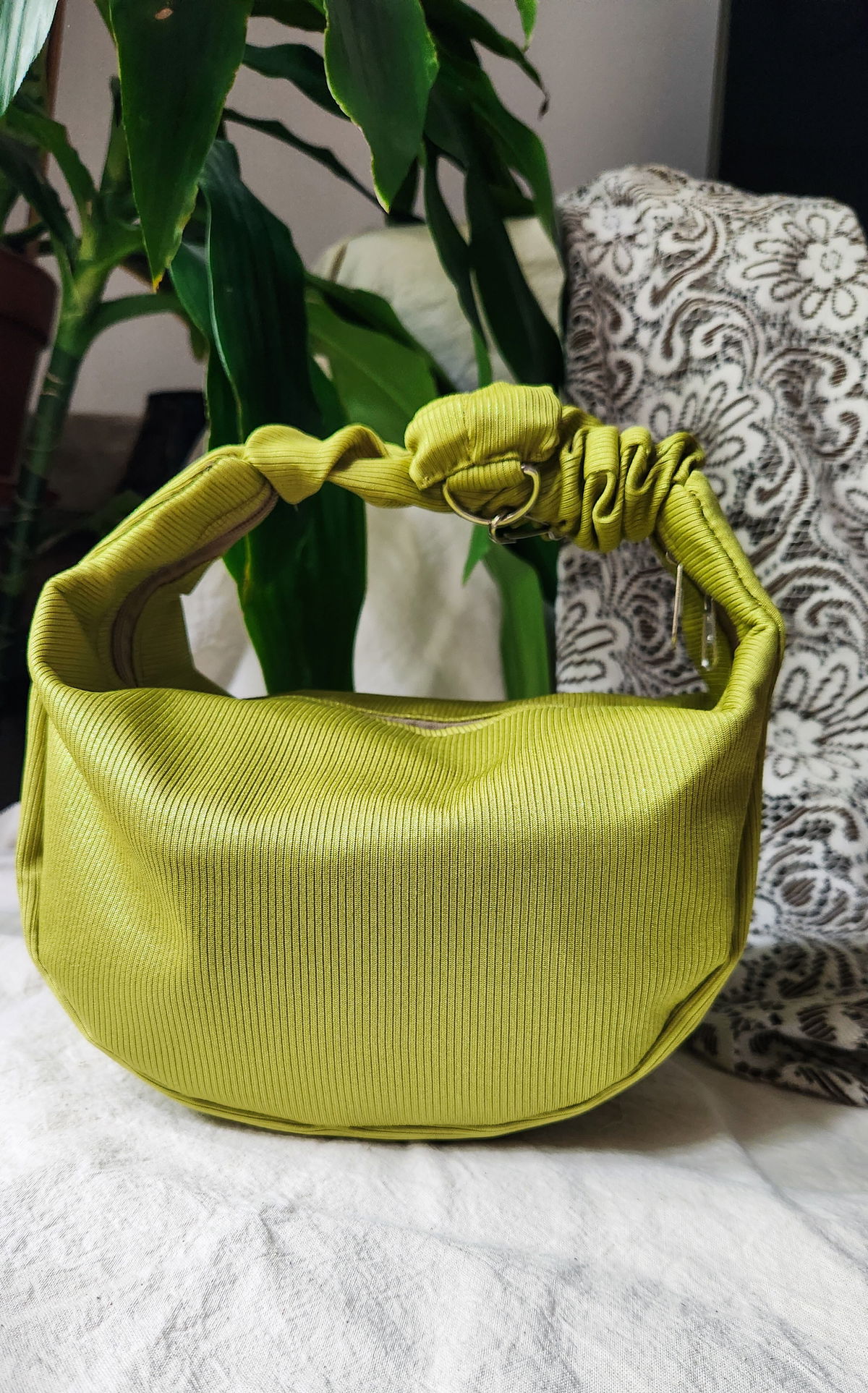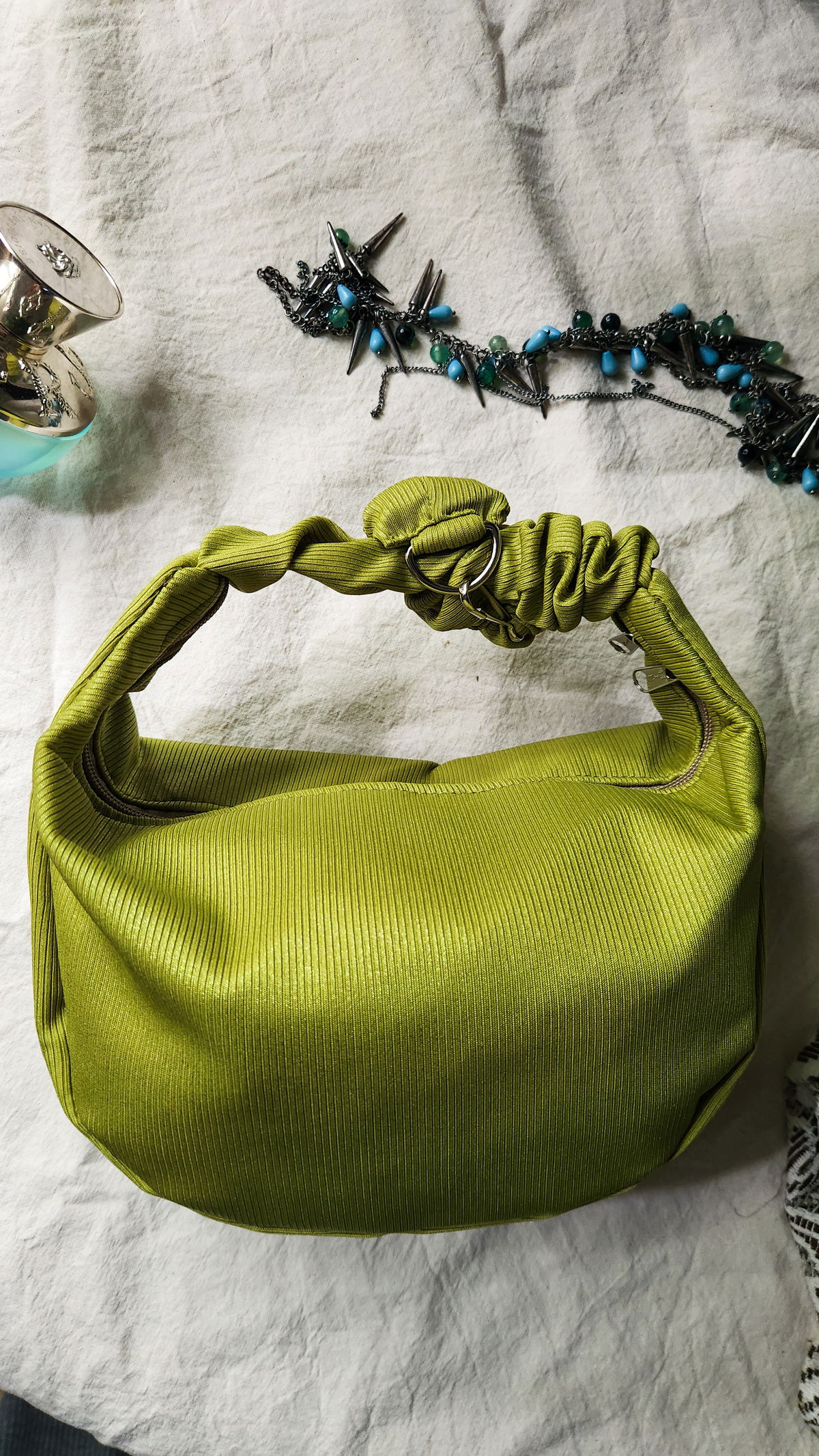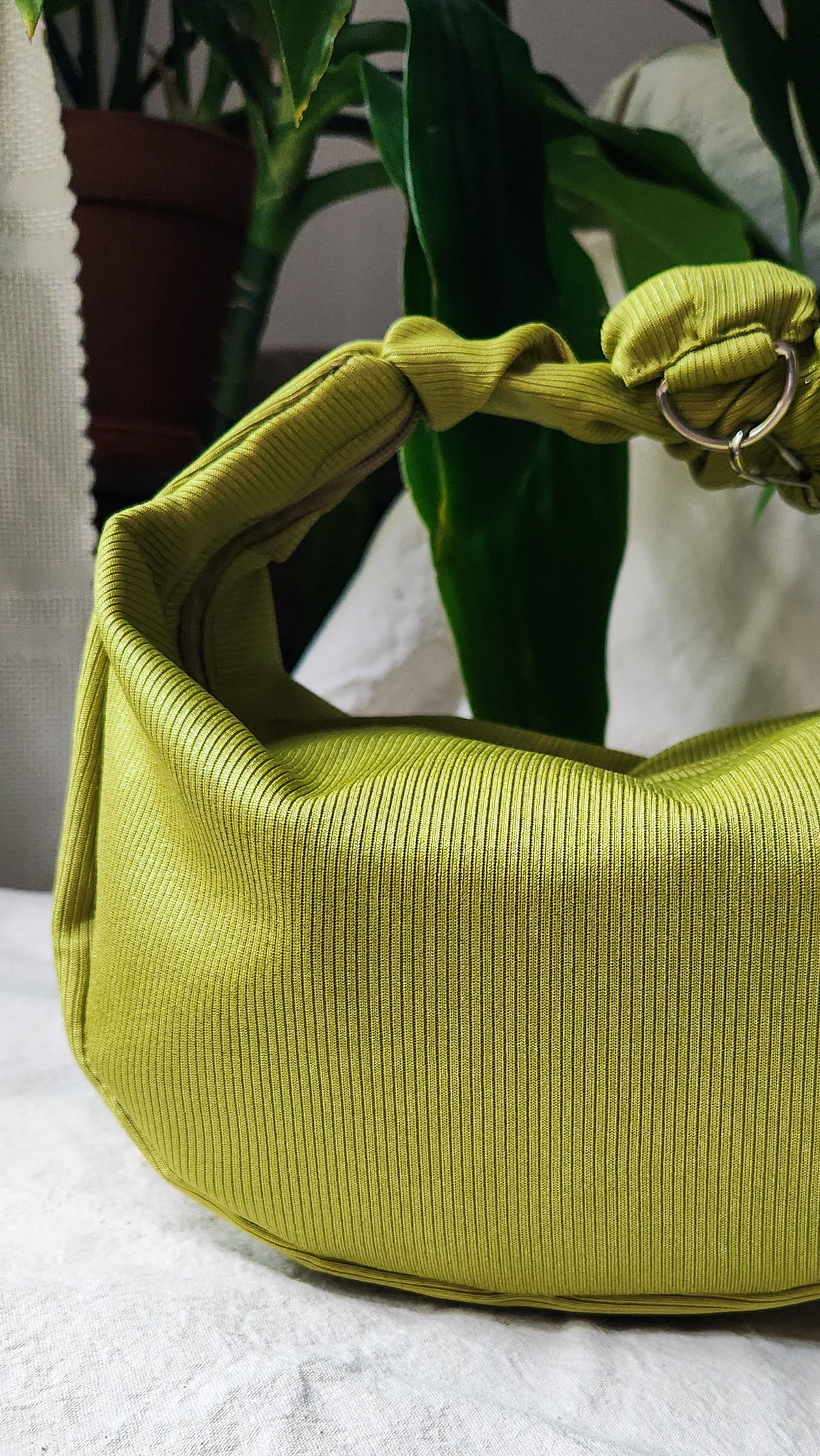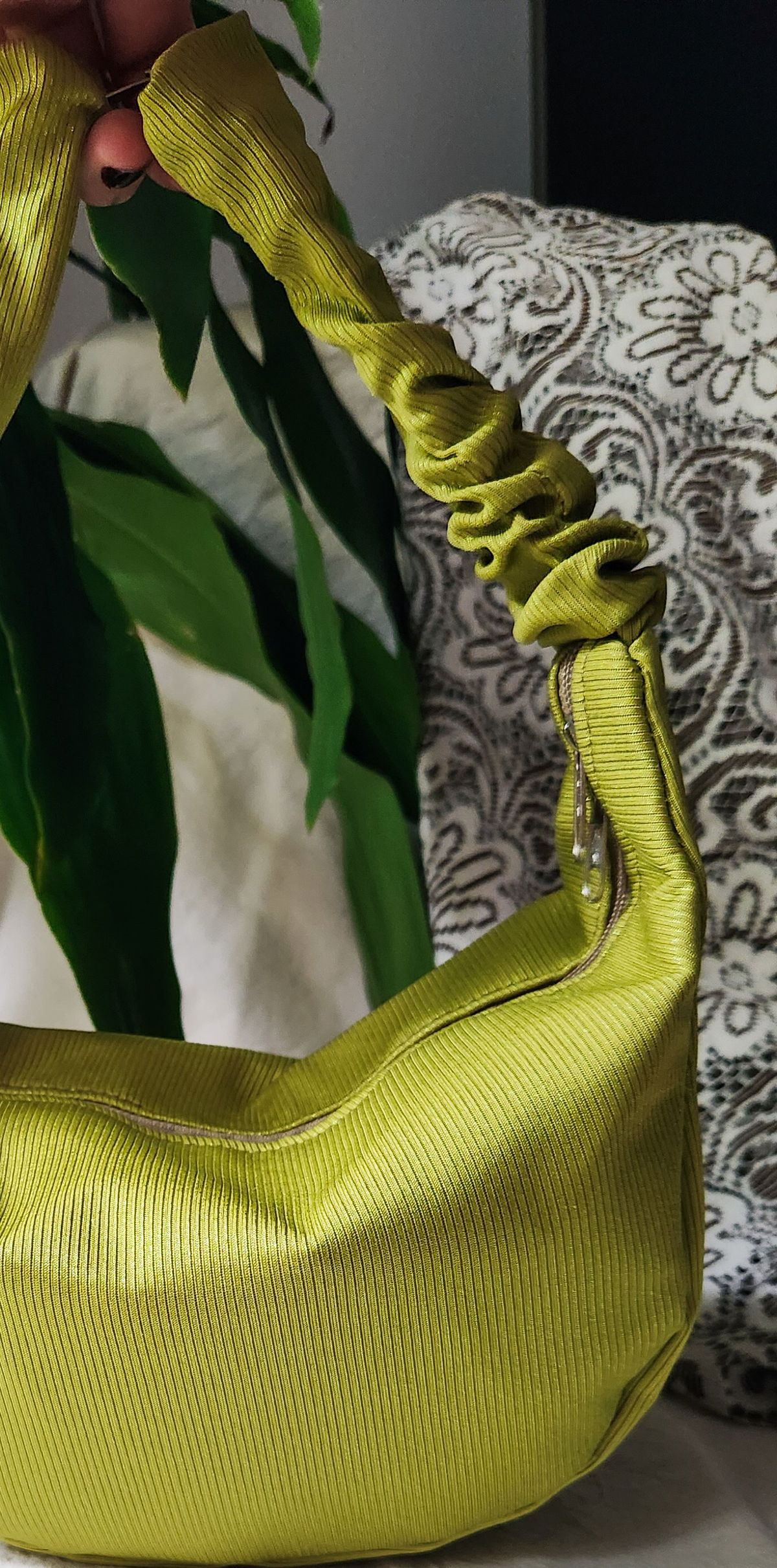Este bolso adaptable de diseño curvo es el accesorio de tendencia que necesitas. Se presenta en un vibrante verde pistacho y está confeccionado en suave morley acanalado, un tejido que incorpora sutiles brillos tornasolados. Ideal para llevar al hombro o como bolso de mano, este mini bag inyecta color y estilo a tus outfits.