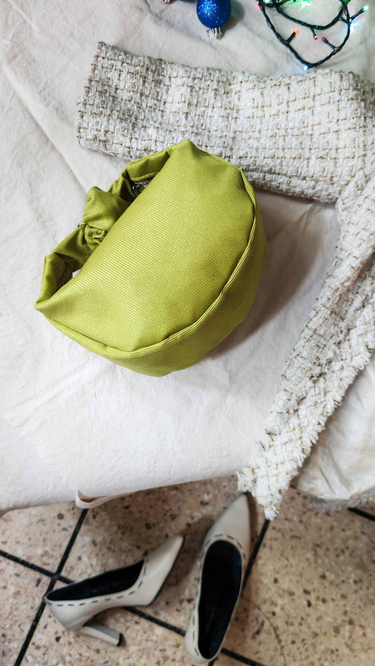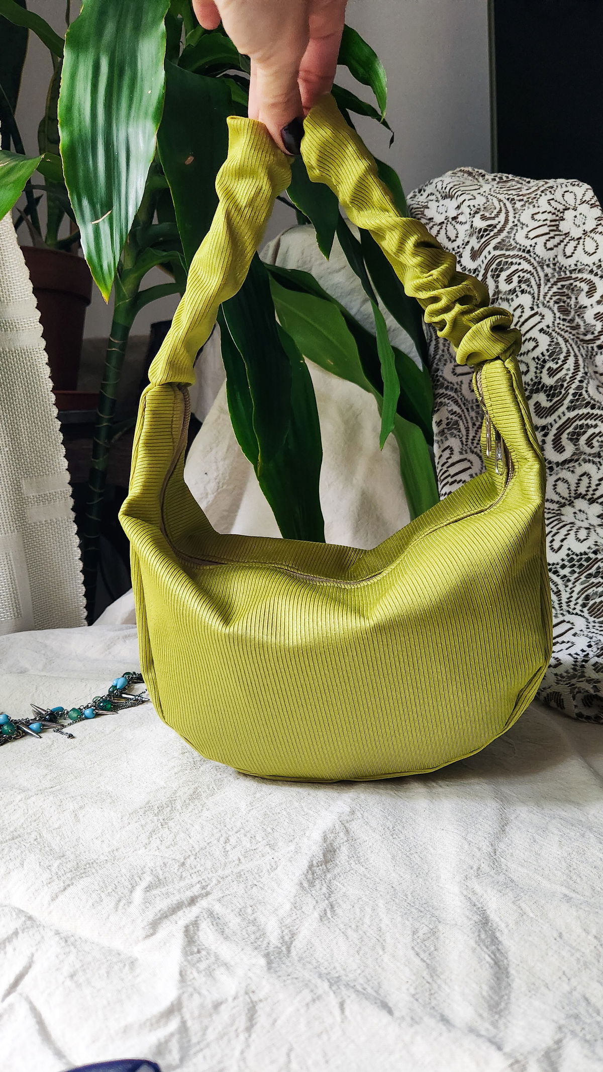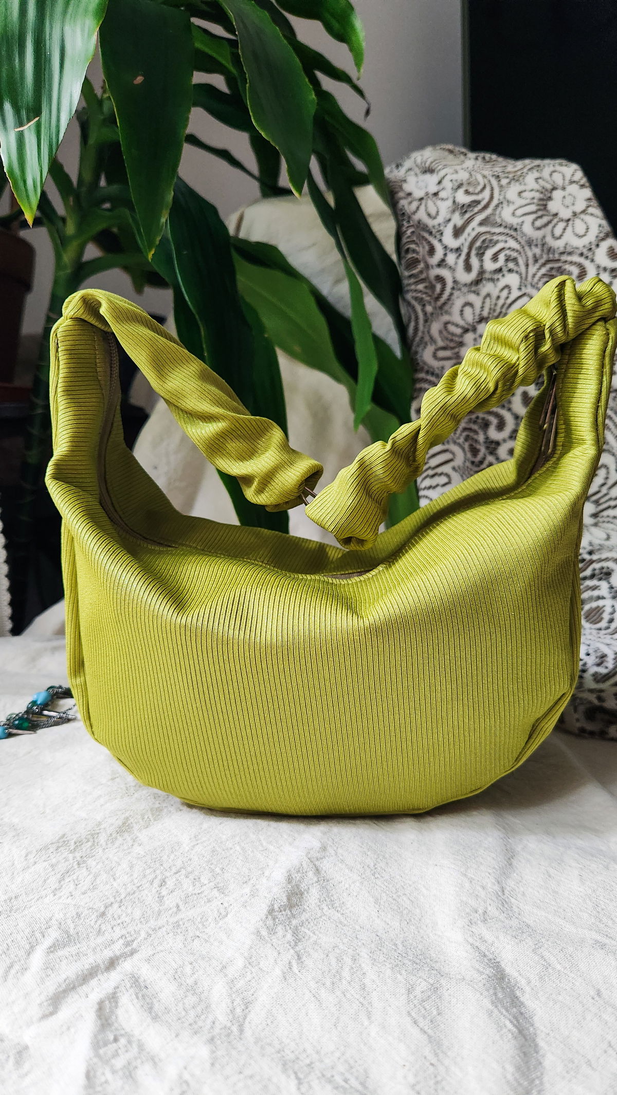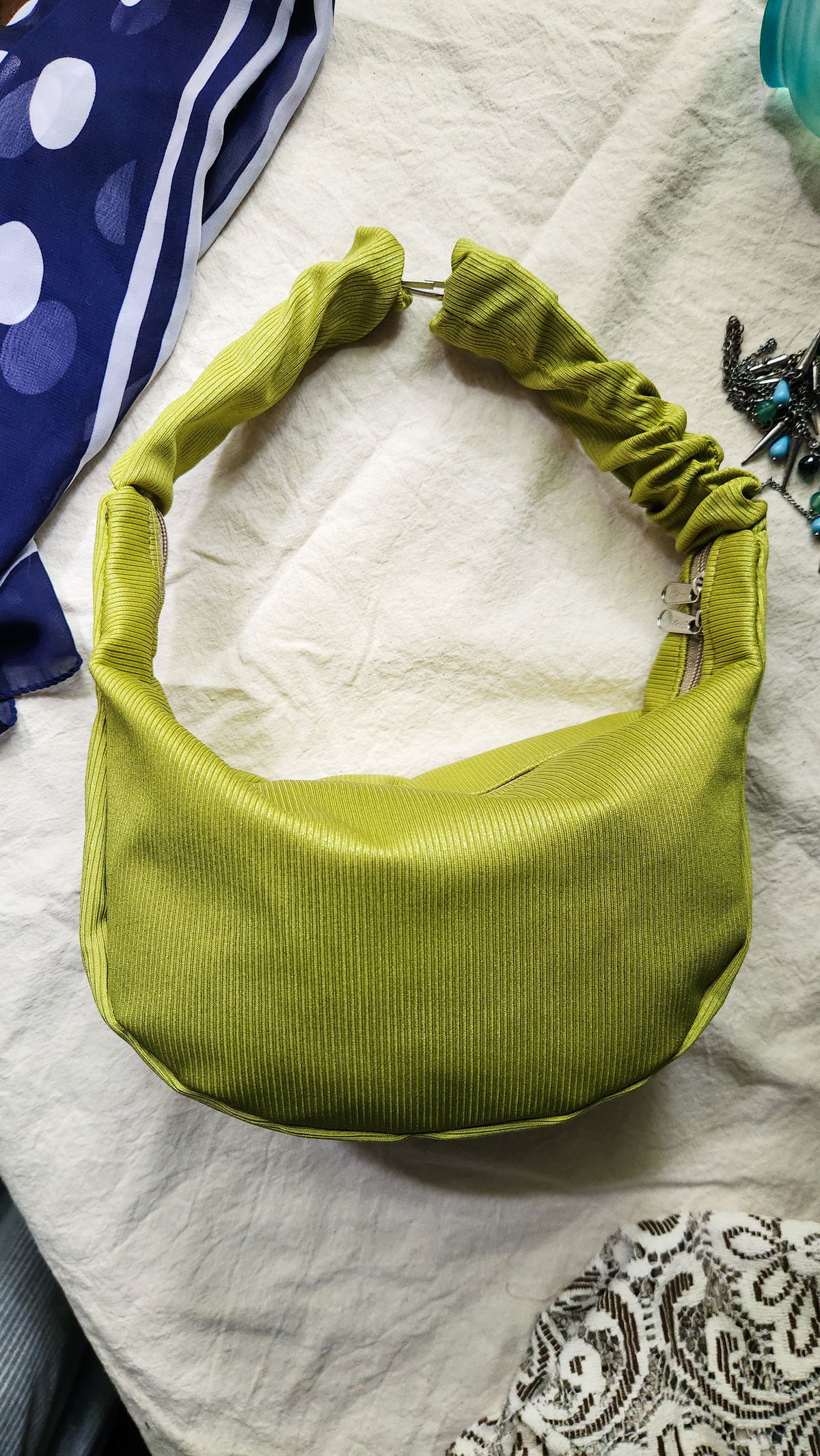 Este bolso adaptable de diseño curvo es el accesorio de tendencia que necesitas. Se presenta en un vibrante verde pistacho y está confeccionado en suave morley acanalado, un tejido que incorpora sutiles brillos tornasolados. Ideal para llevar al hombro o como bolso de mano, este mini bag inyecta color y estilo a tus outfits.